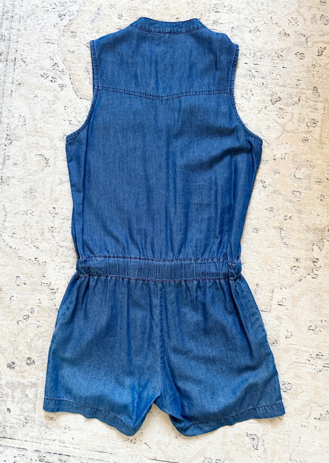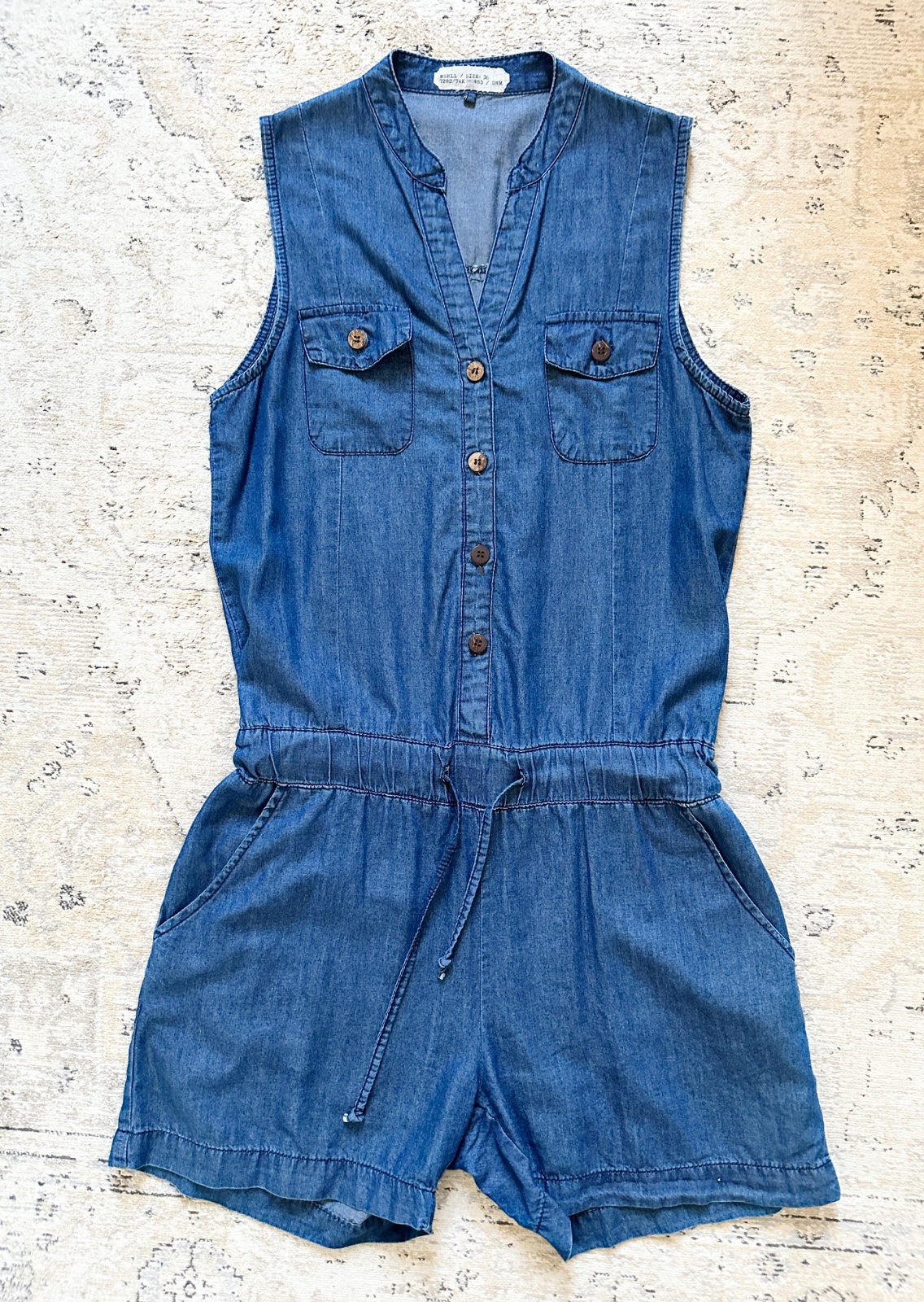 Šmrncový overal na leto, z tenšej mäkkej denim látky. Pás je nariasedý do gumy a ešte je v ňom uväzovacia šnúrka, po bokoch vrecká na ruky. 65% bavlna, 35% lyocell. Pranie v pračke 30°C. V super stave, bez poškodení.