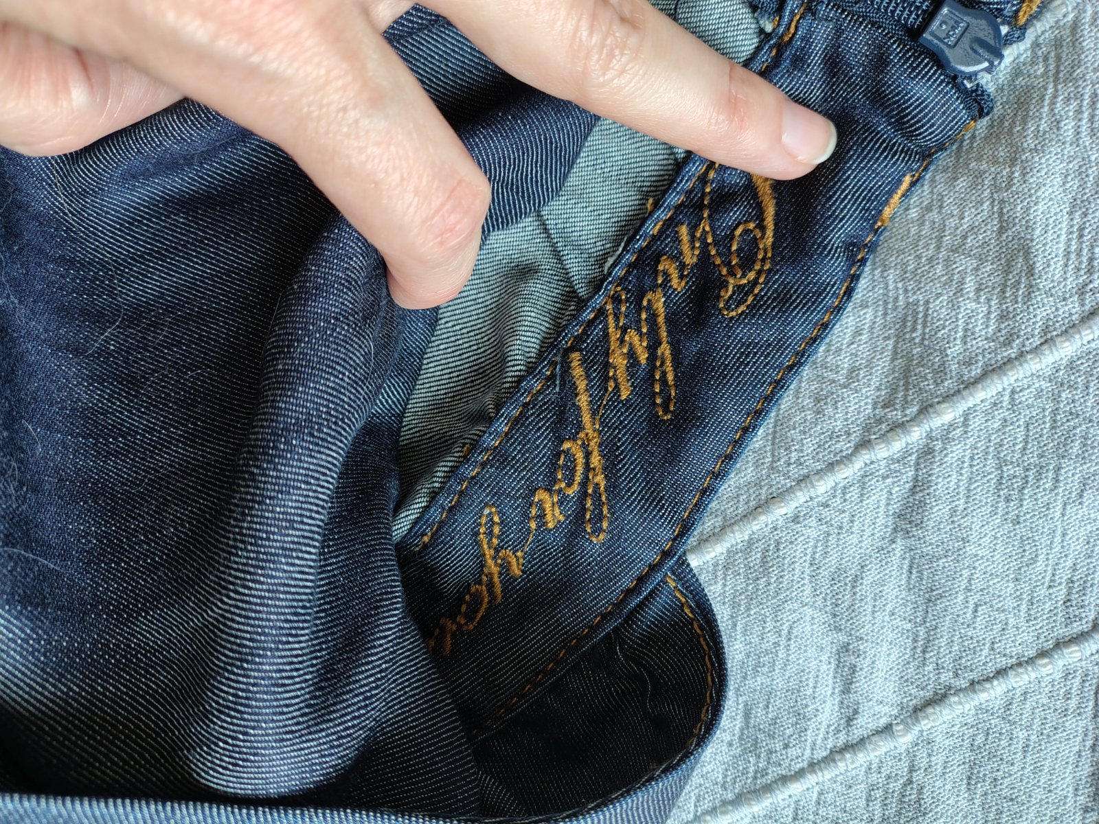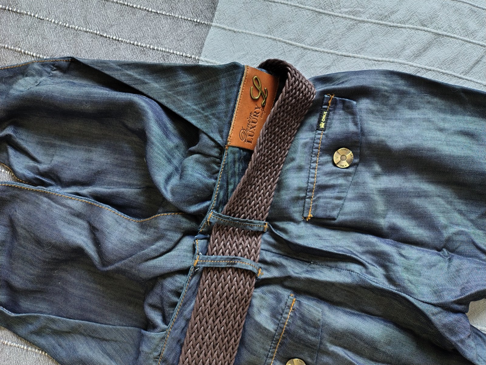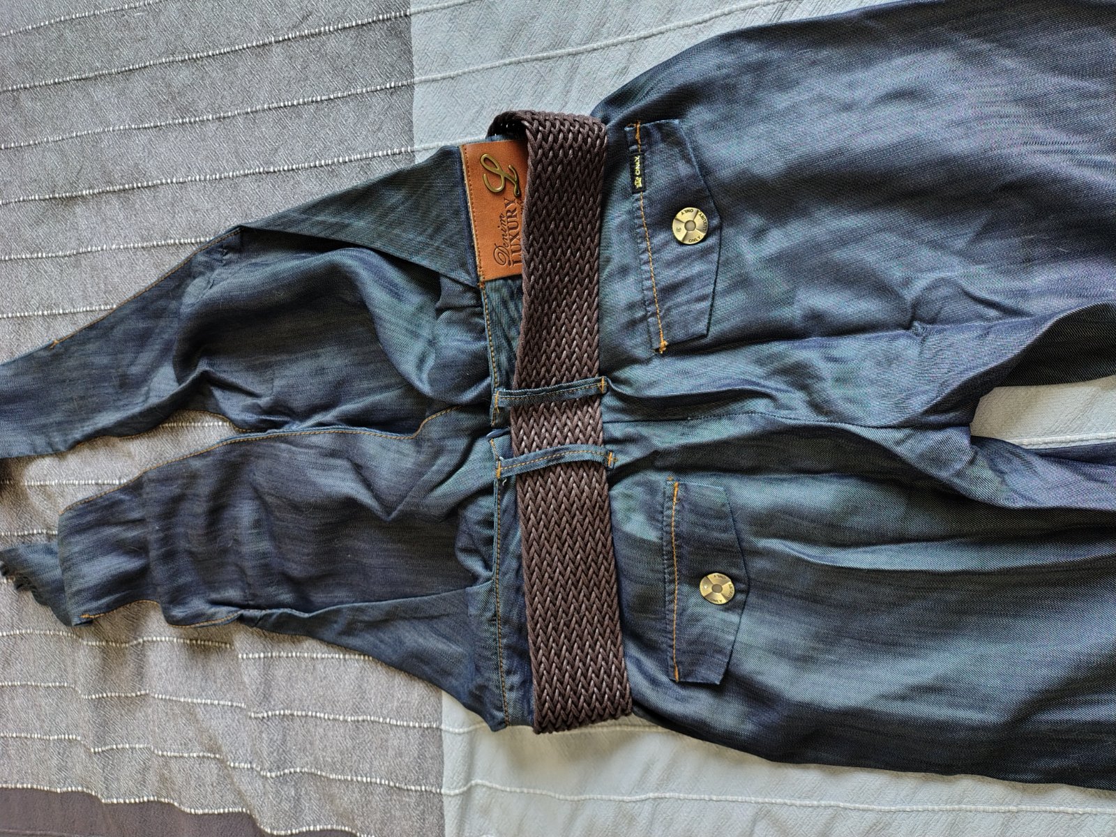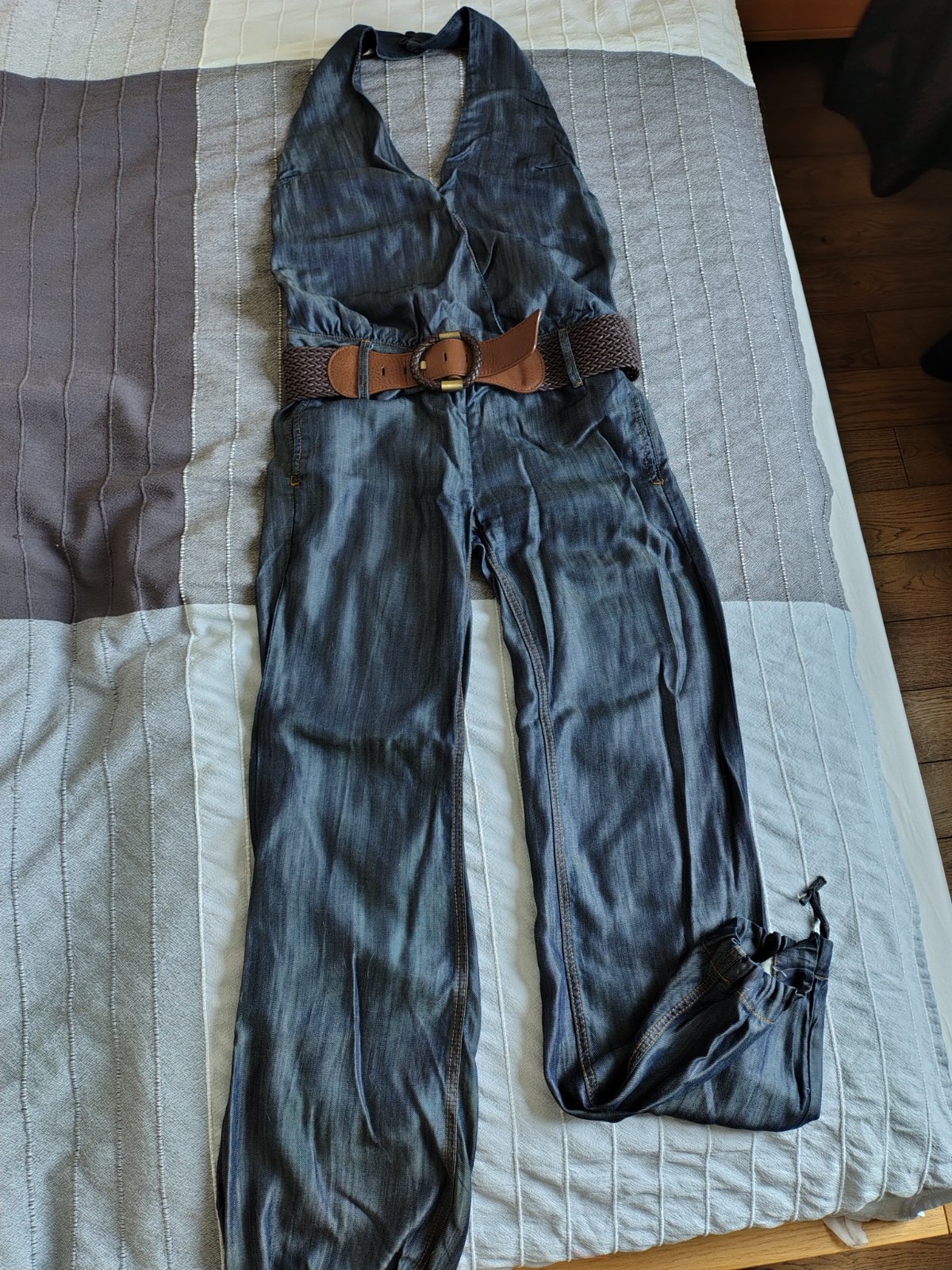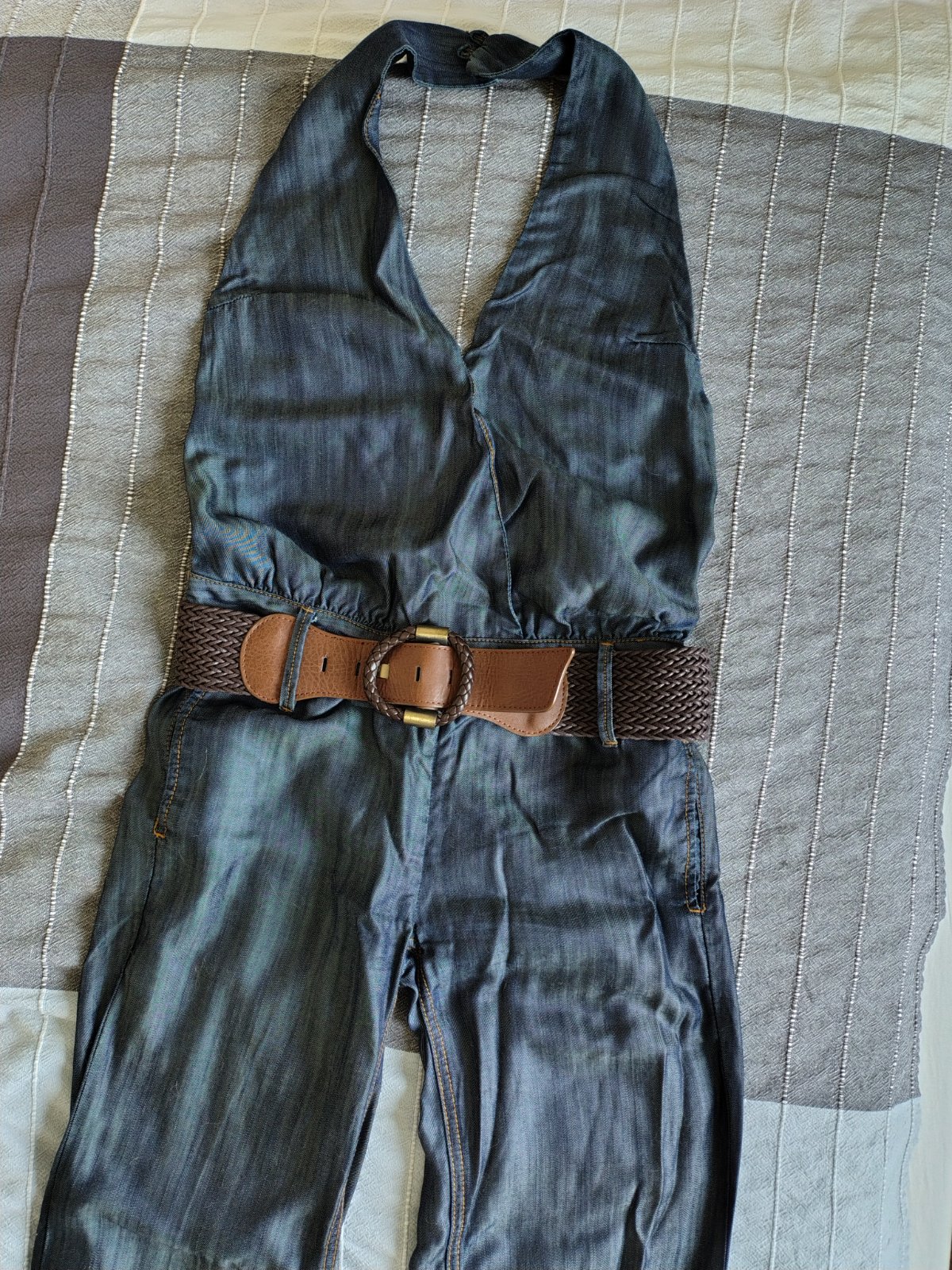 Denimovy lahky overal,krasny, ozaj luxusny, nenosim, odkladam a uz mi je tesny ...:) Fajn lahsi material, nie tazka riflovina. Nohavice maju dole snurku, takze sa netreba bat ze bude dlhy...