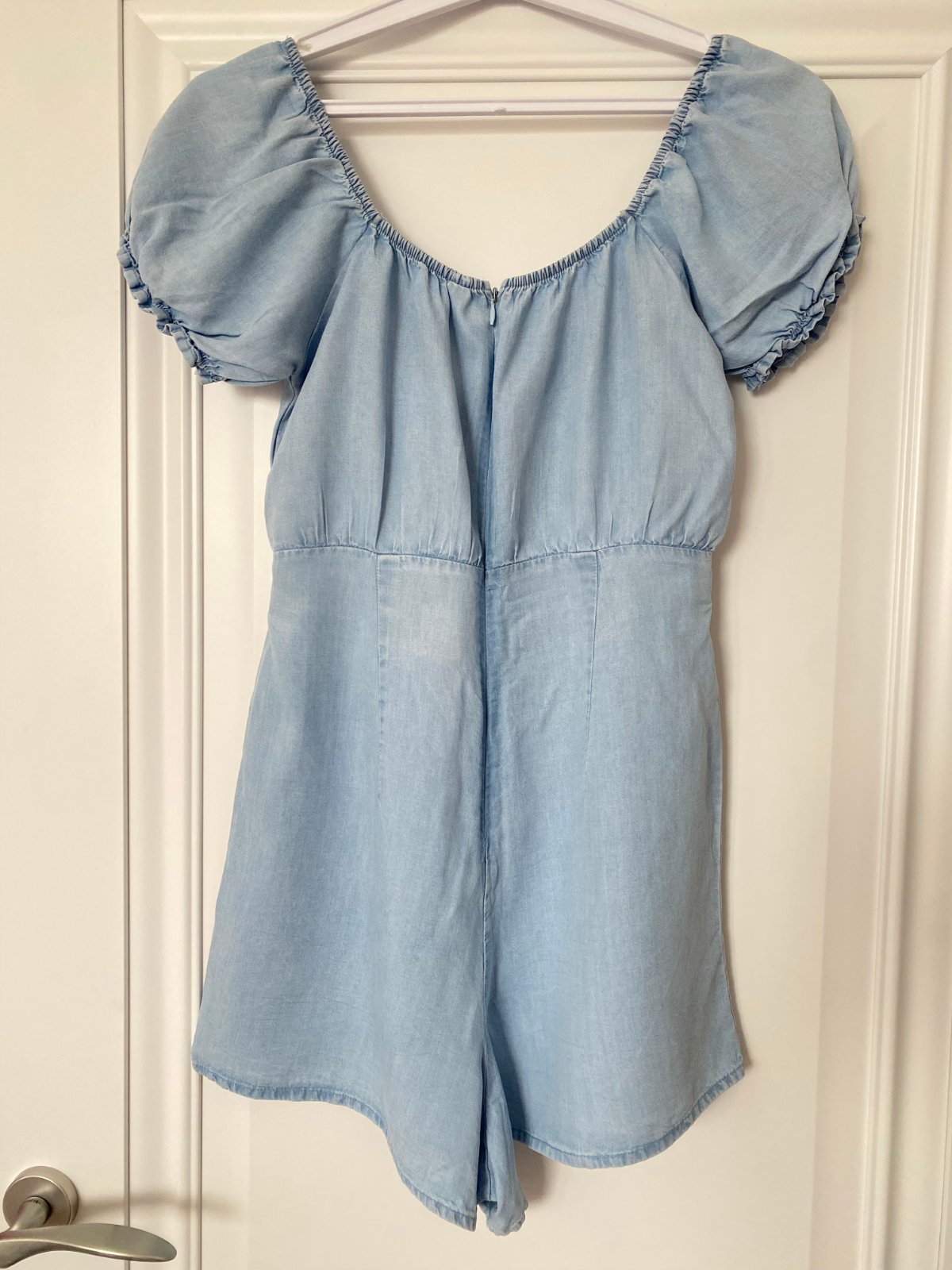Zaujímavý overal z jemnej, ľahkej rifloviny, z pufovými rukávkami, predná časť otvorená, vzadu na zips. Dĺžka je 72 cm, šírka je 33cm. Veľkosť XXS. V dobrom stave.