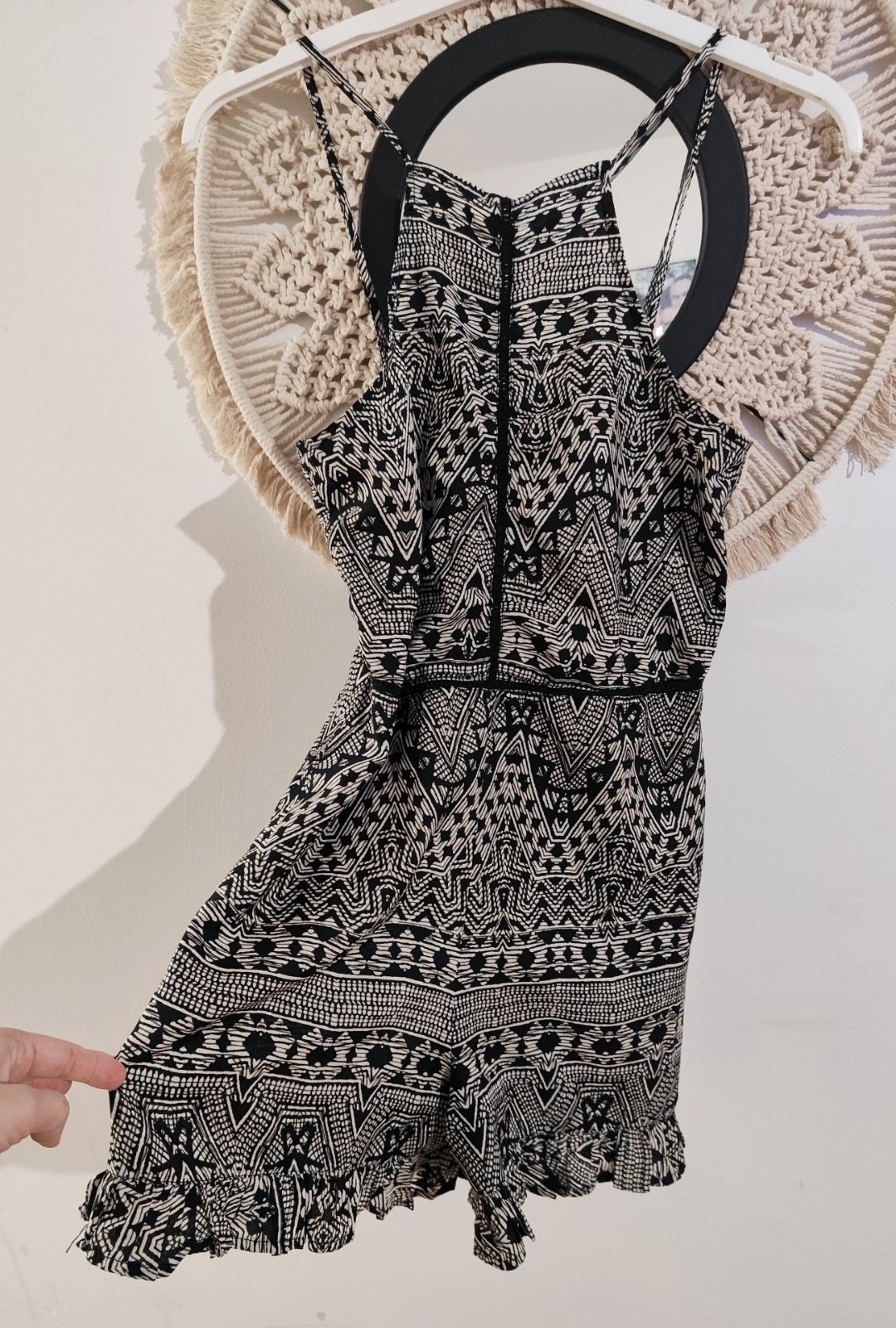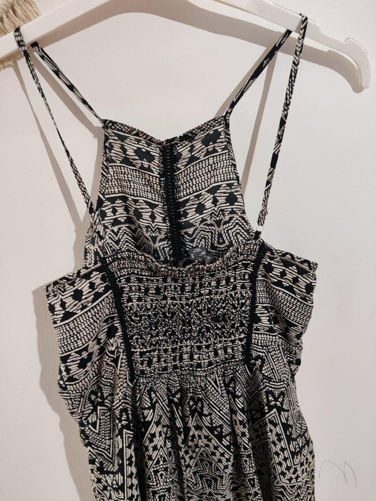 oblečeny minimalne, odopinatelne ramienka tiež regulovateľna dlžka ramienok. v pase na gumičku a viazanie. tenky prijemny material, vrecka vpredu.