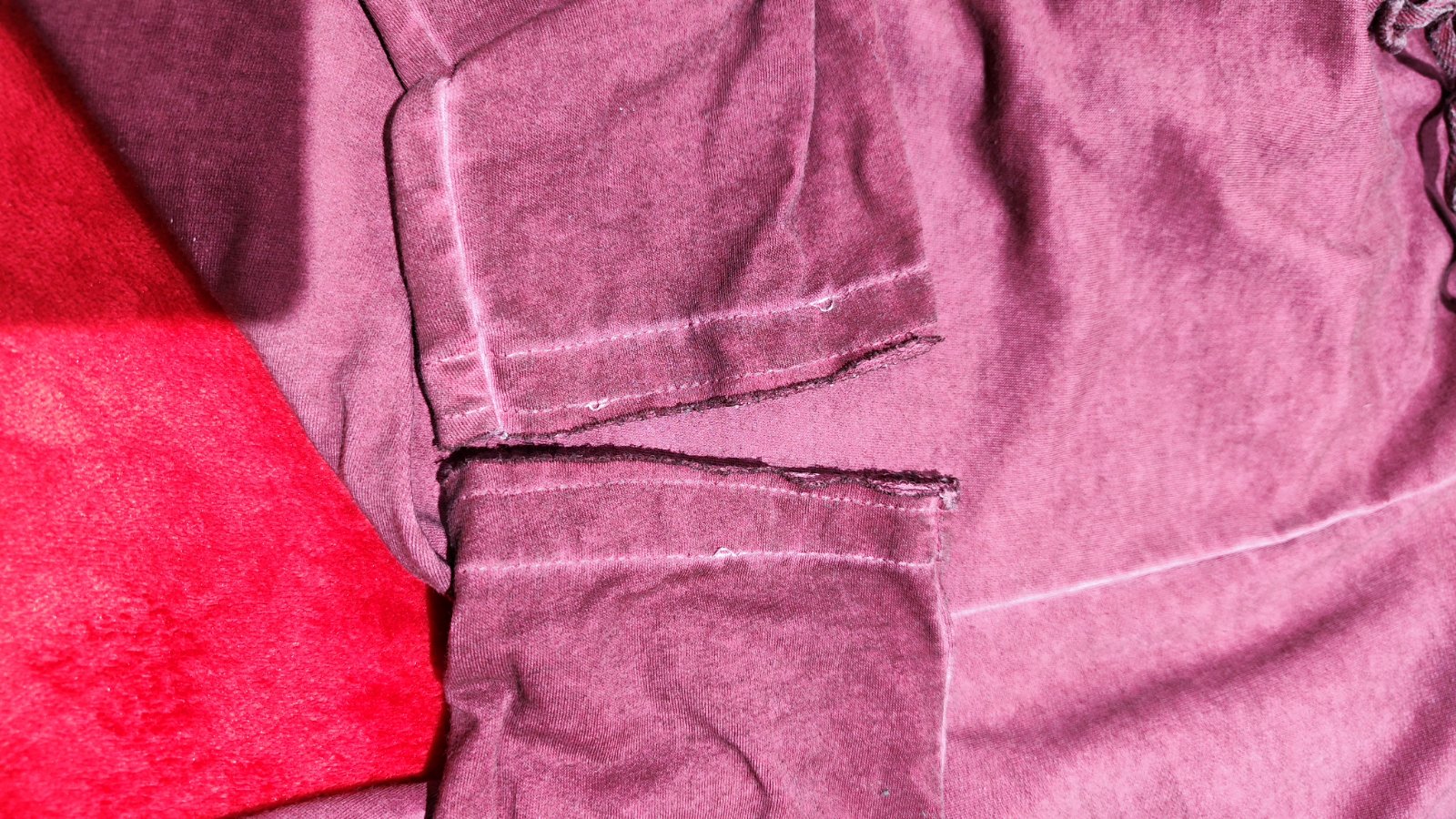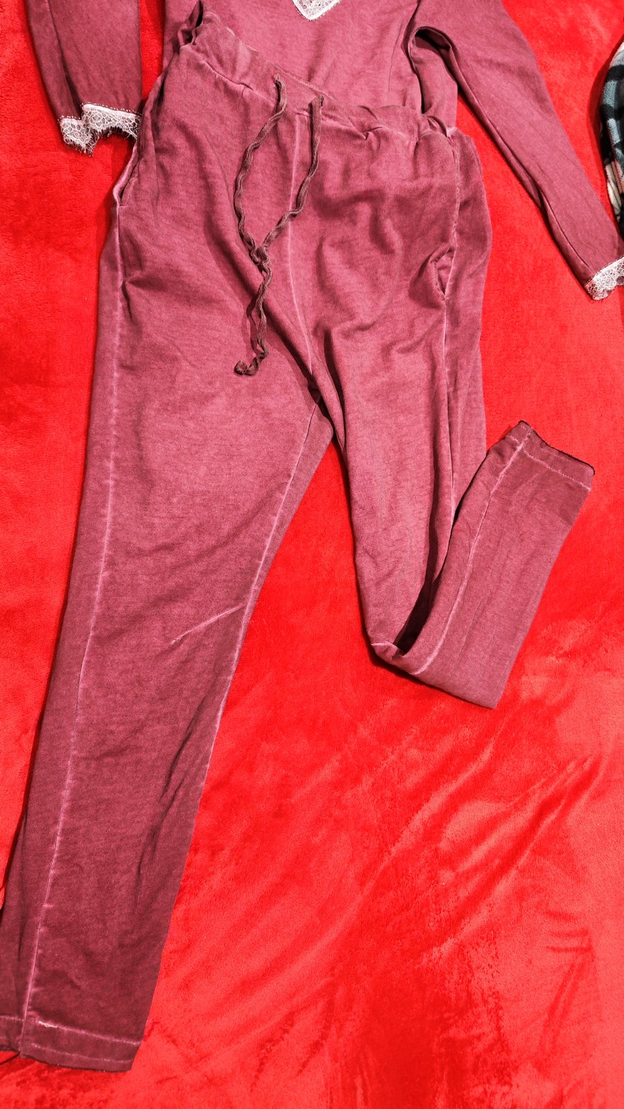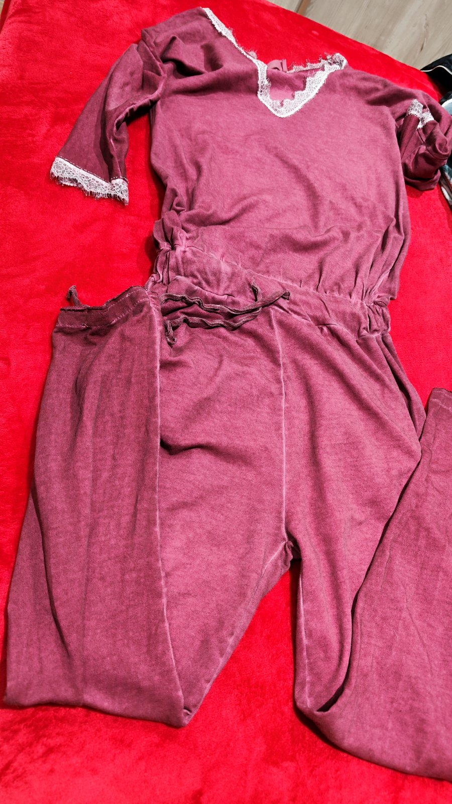 V bordovo - fialovej farbe, veľkosť písaná L ale tým, že má v páse gumu a aj zavazovanie v pohode sadne na menšie veľkosti. Zozadu má lebku. Guma v páse sa natiahne na maximálnu šírku 45 cm.