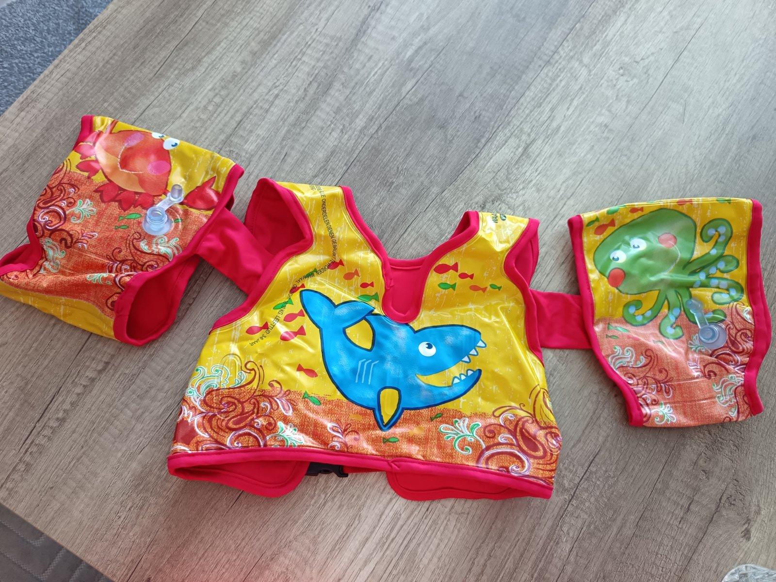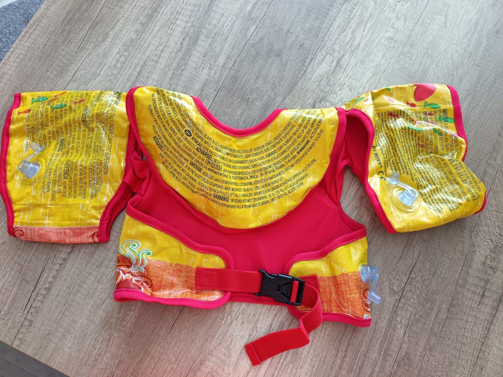 Predám 1x použitú plávaciu vestu s rukávnikmi, ako nová. Nosnosť 18-30kg. Cena 4e + pošta.