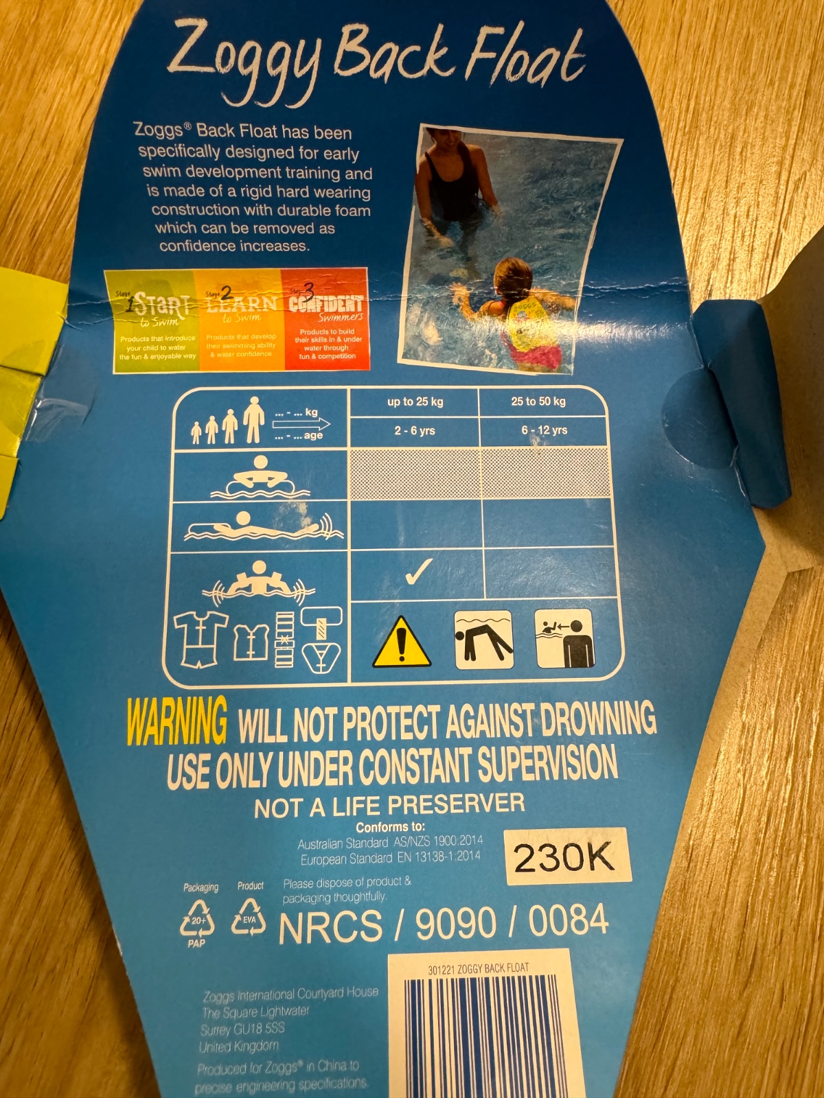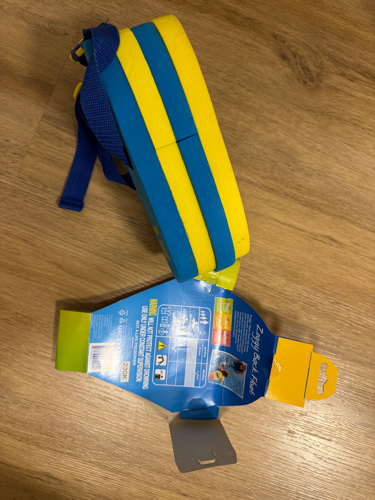 Modrá a žltá so znakmi Zoggy Zoggy Backfloat je navrhnutý tak, aby vytváral vztlak, zatiaľ čo sa vaše dieťa aktívne snaží plávať, má odnímateľné vrstvy, ktoré vám umožňujú odstrániť jednu vrstvu naraz, keď vaše dieťa získa dôveru vo vodu aby ste mohli znížiť vztlak