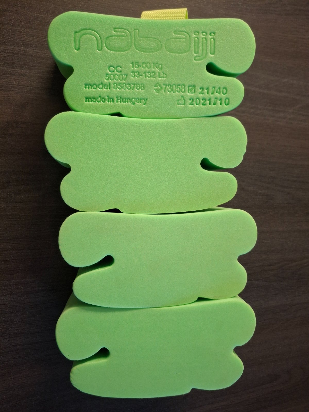 Detský plavecký pás 15 – 60 kg s penovými blokmi zelený.Plavecký pás pomáha dieťaťu naučiť sa plávať vo vodorovnej polohe. Opasok pozostáva zo 4 penových blokov a trojbodovej bezpečnostnej pracky.kupeny novy pc 13e.