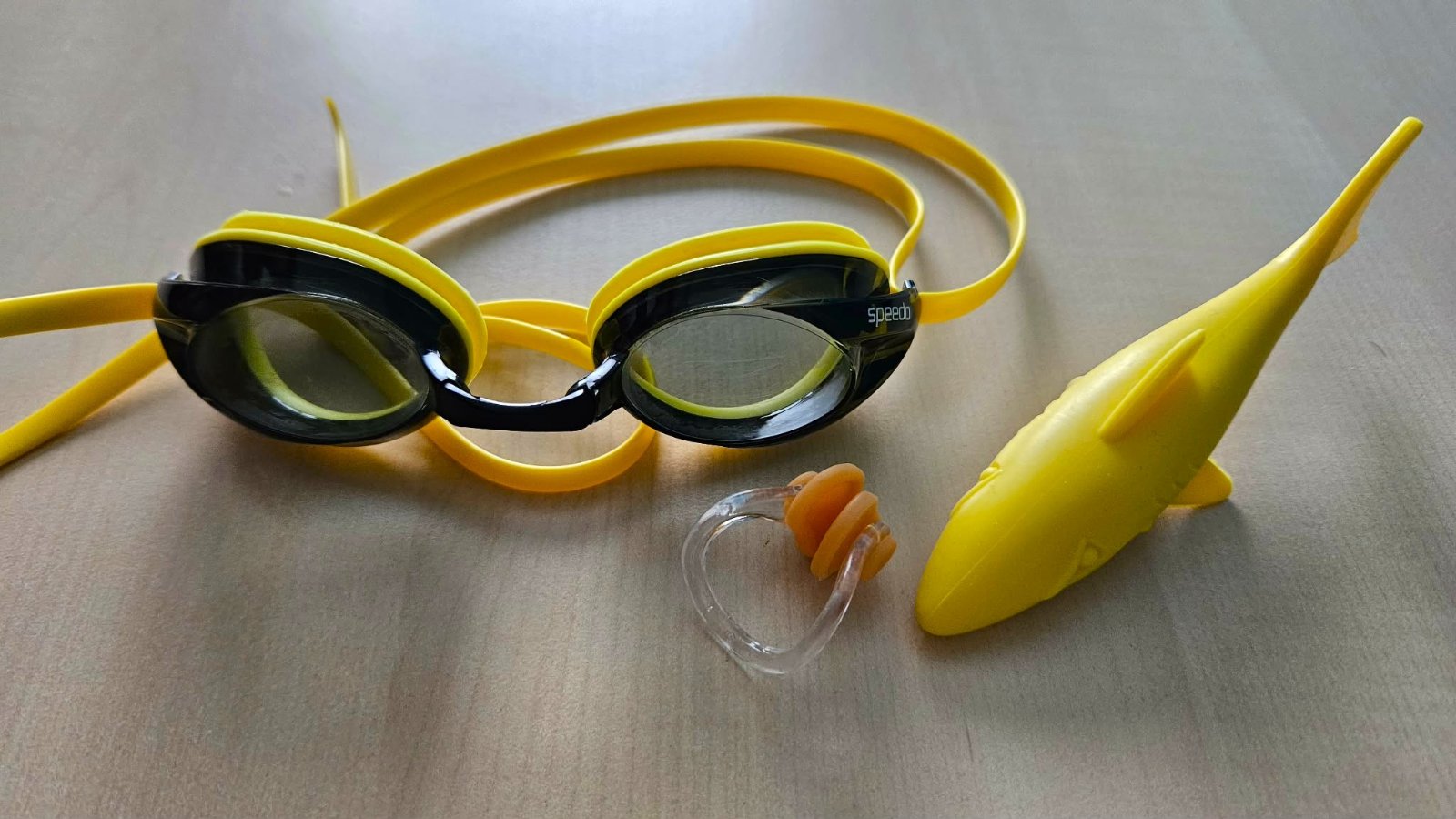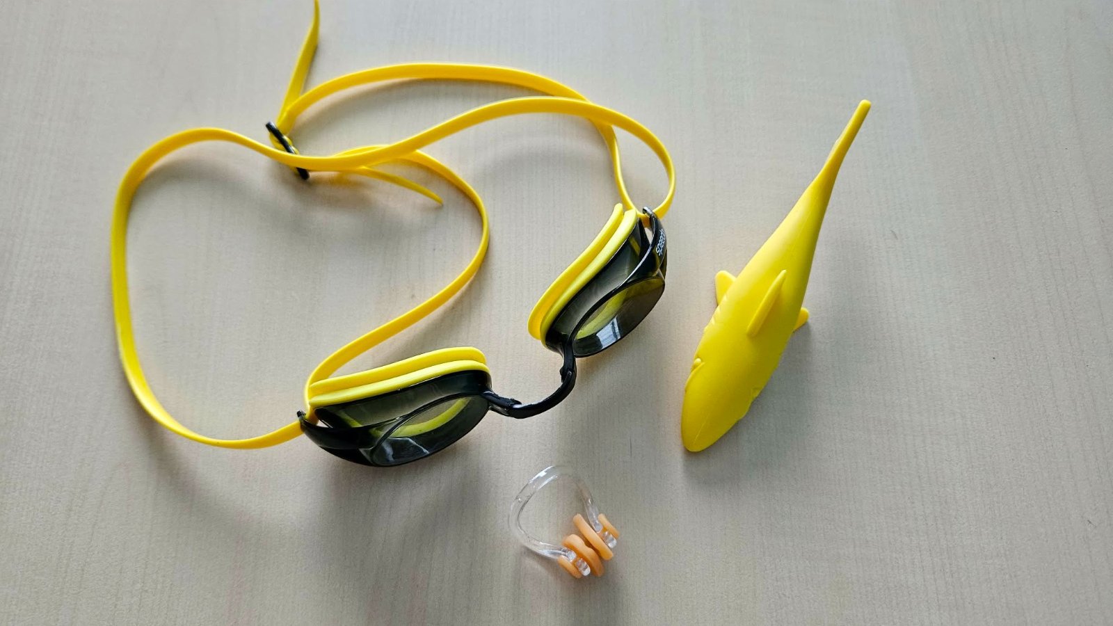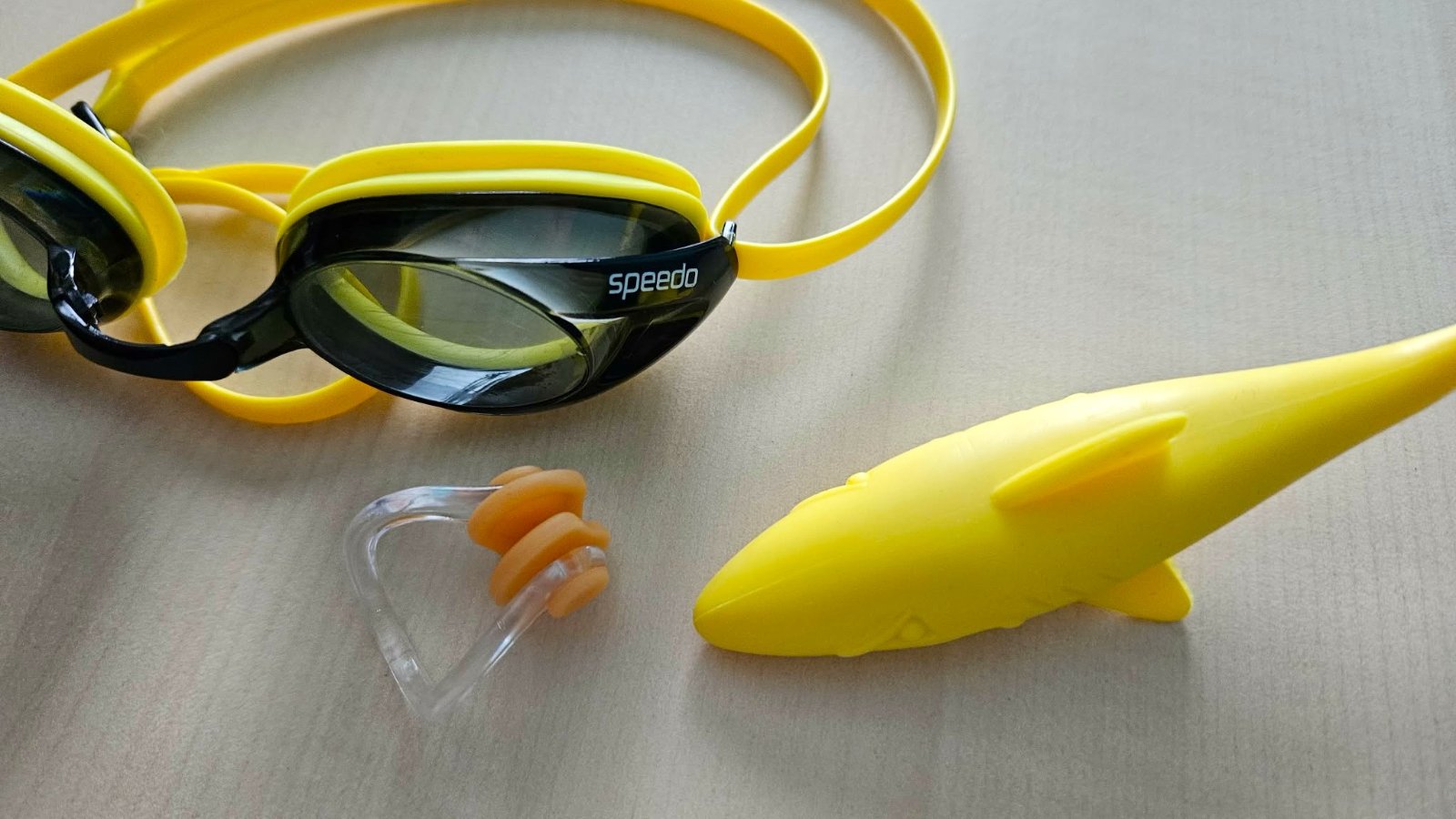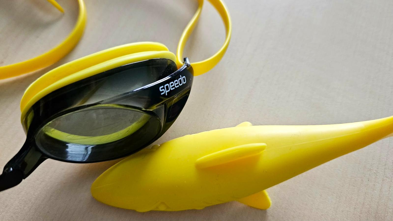 Plavecký set, Speedo okuliare, štipec na nos a hračka žralok