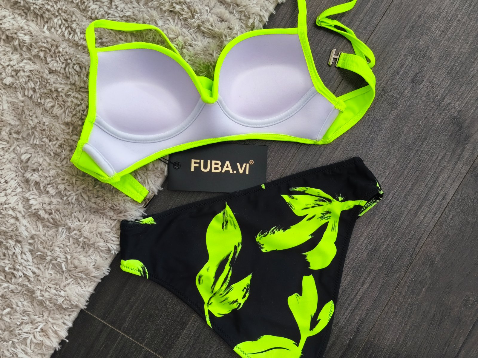 Vystužená push up podprsenka s nastaviteľnými pevnými ramienkami a zapínaním na sponu. Nohavičky klasického strihu. Prehoz s opaskom. Posledný kus.