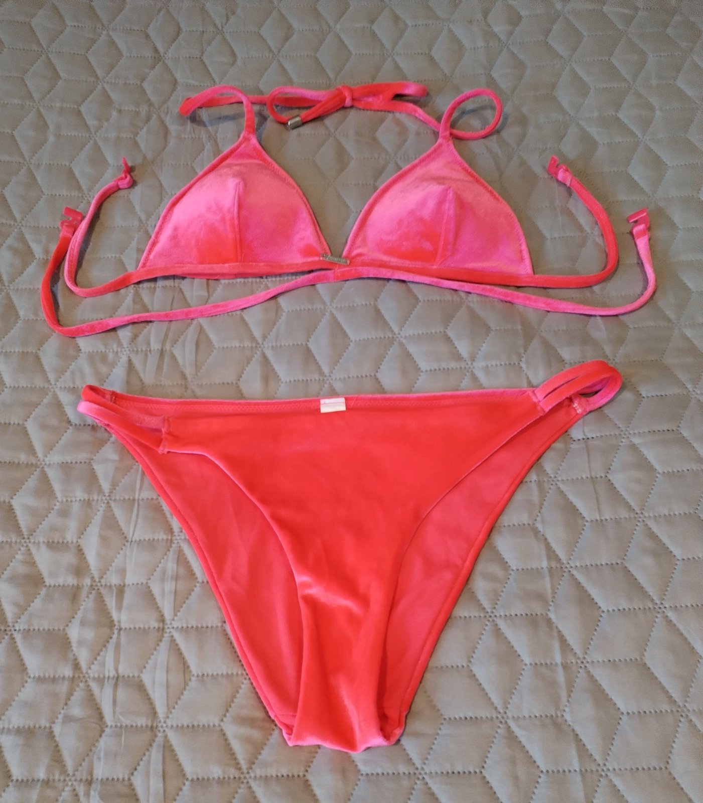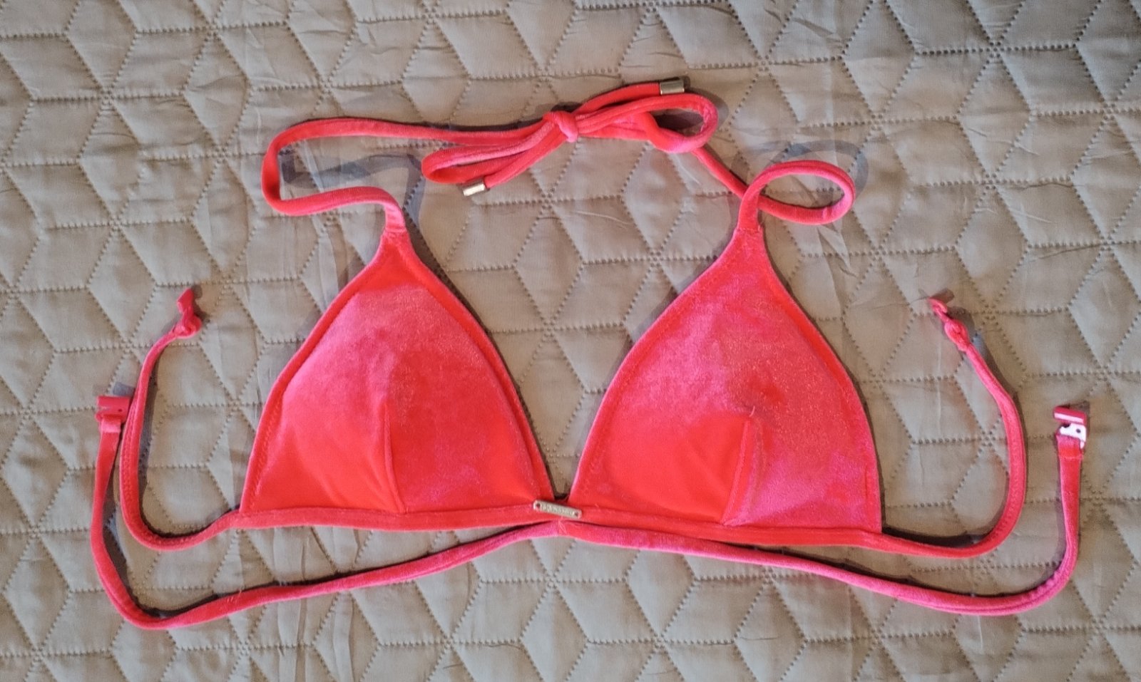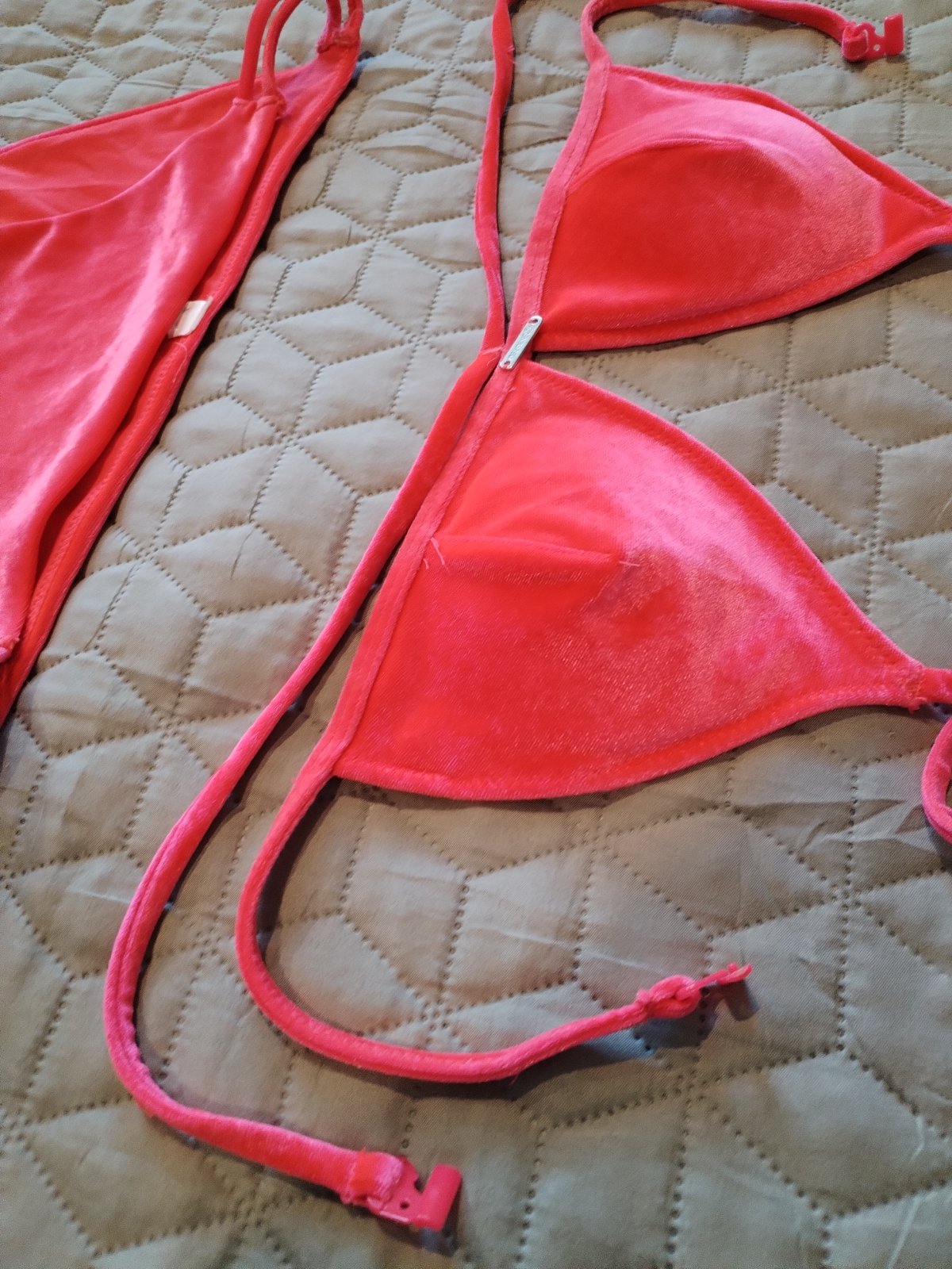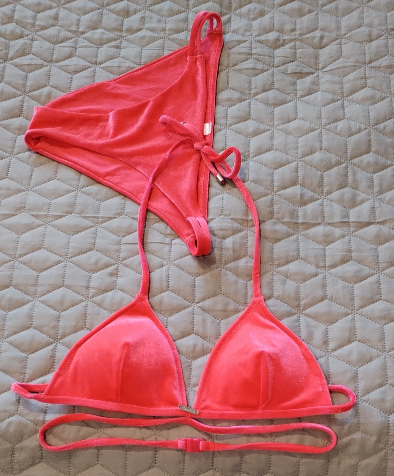 Perfektné dvojdielne plavky, podprsenka na zapínanie, dvojité efektne šnúrky, na krku na zavazovanie, klasické nohavičky, podprsenka spevnená , dajú sa vložiť vankúšiky, elastický kvalitný materiál, materiál je akoby jemne plyšový s jemným odleskom, vyzerajú perfektne, bez poškodení.