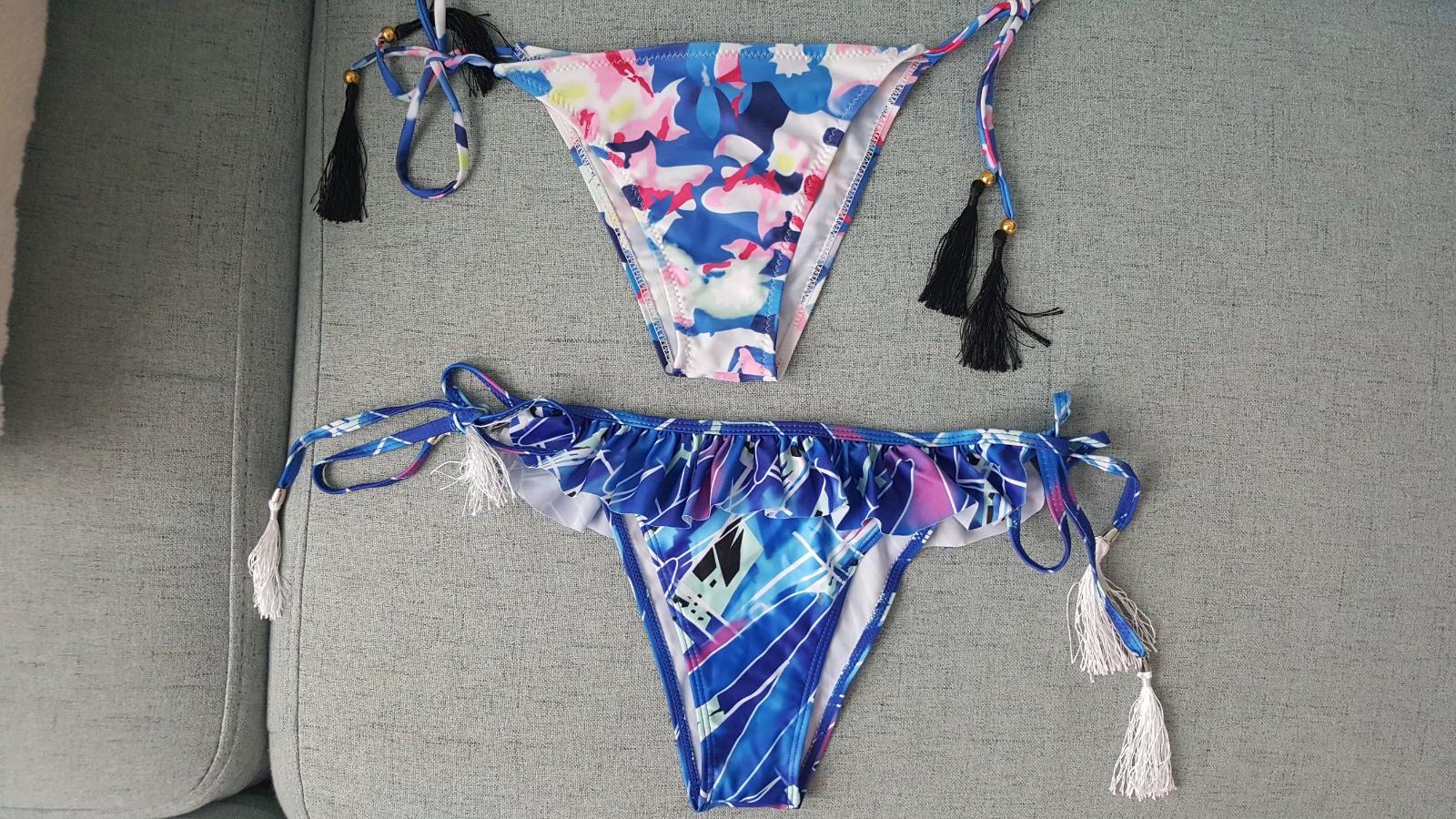 Predám nové dámske bikiny. Veľkosť spodného dielu L, vrchný diel B-C košíky, obvod 69cm. Bikiny sa dajú uviazať okolo krku alebo sa dajú nosiť bez šnúrky. V prípade záujmu bližšie rozpíšem. Dajú sa kúpiť aj separé len vrchný alebo sporný diel. Na ružových bikinách malá vada...na kraji sa troška parajú perličky, ale šikovná dáma si ich upraví:) viem dať za nižšiu cenu. Cenu som uviedla za pár. 1ks/ 6,50eur. Ružové s perličkami vrchný diel 5eur kvôli malej vade. Poštovné nie je zahrnuté v cene. Osobný odber možný.