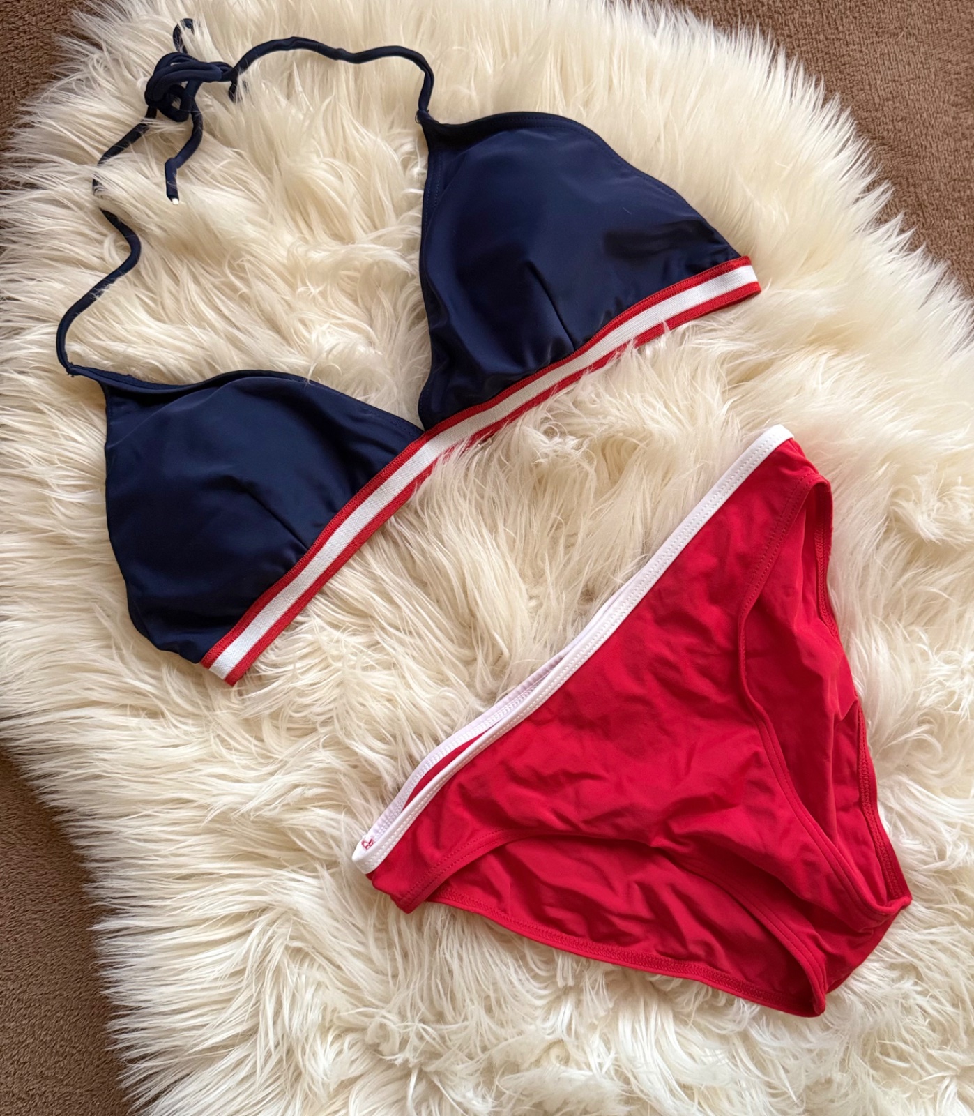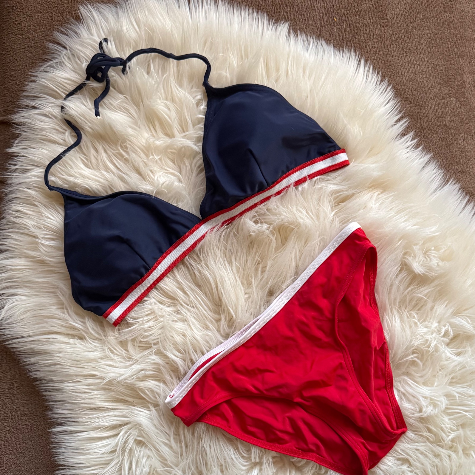 Vrchny diel tmava modra s Červeno bielym pasom , nohavicky cervene s bielym pásikom.