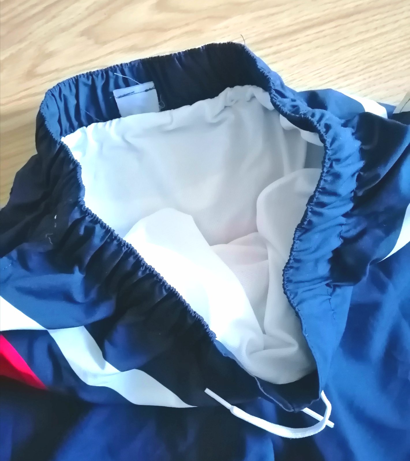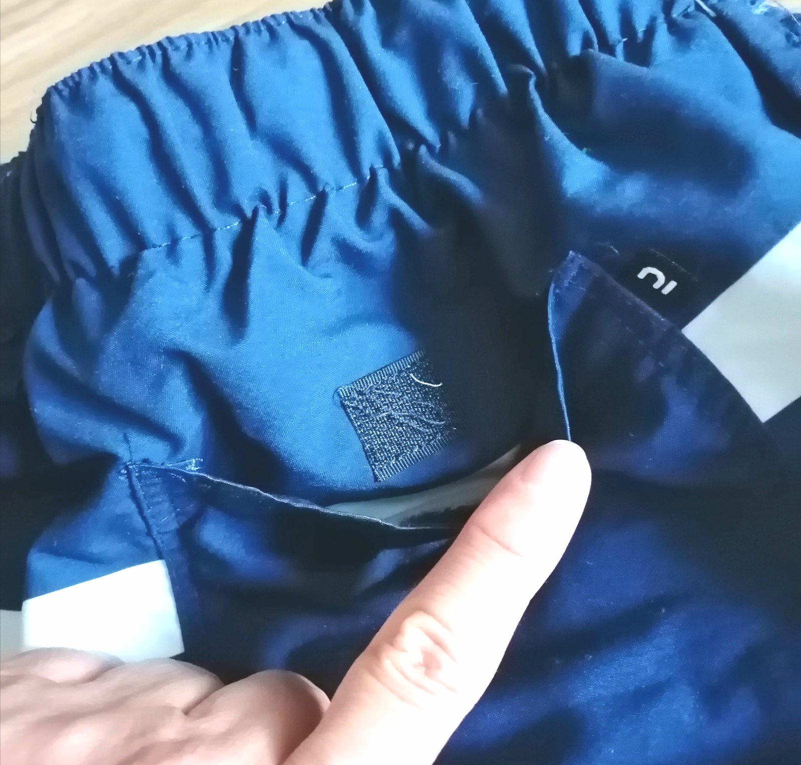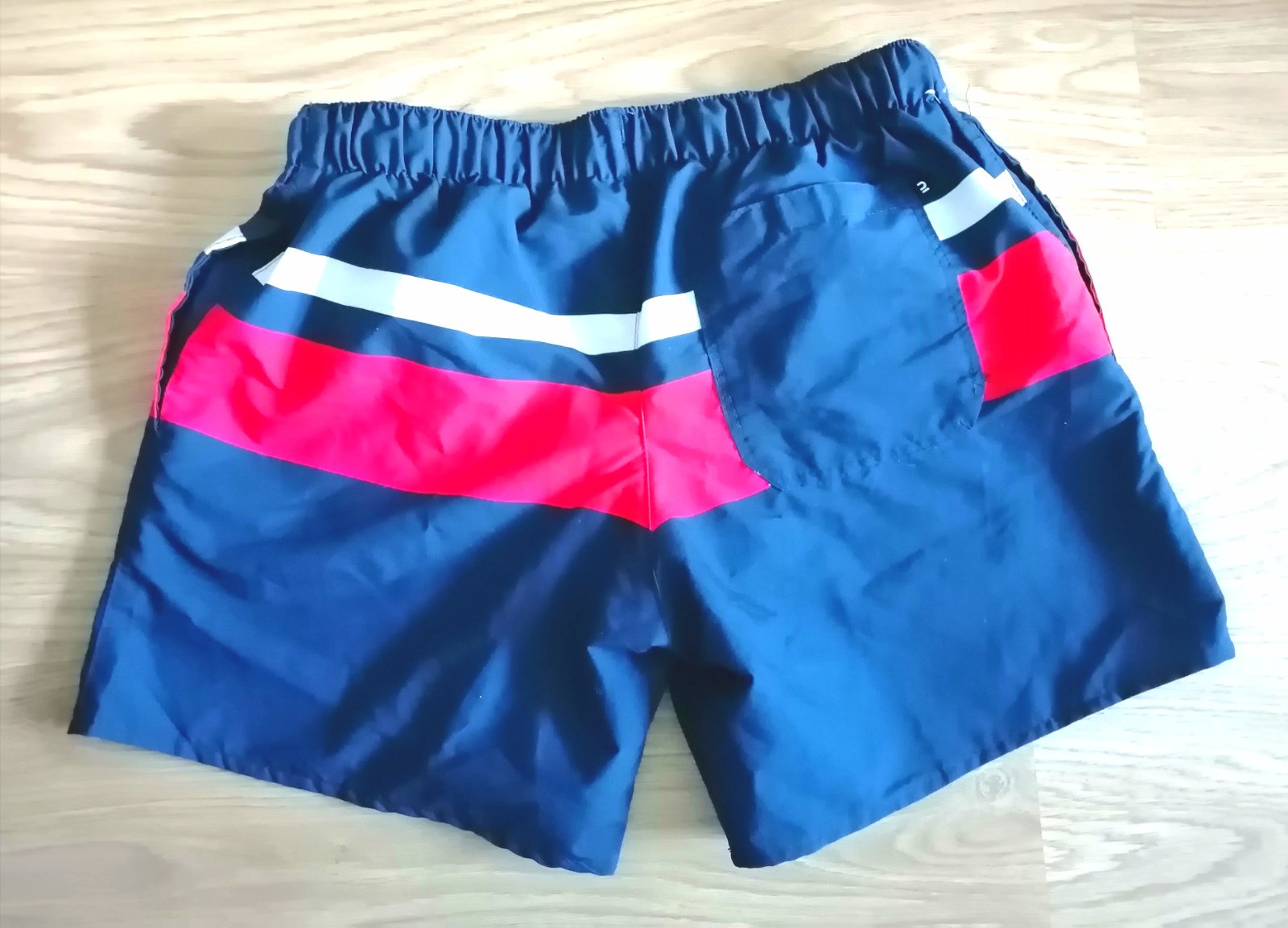 Chlapčenské šortkové plavky od Decathlon, v tmavomodrej farbe s červenými a bielymi detailami, v páse guma a šnúrka, vzadu vrecko na suchý zips.