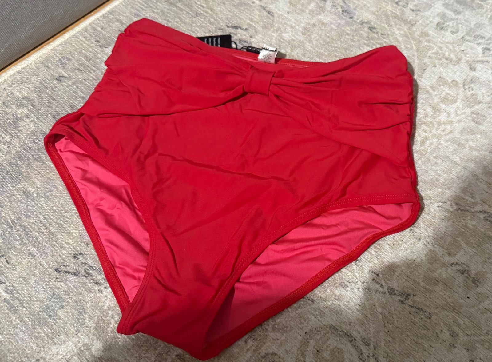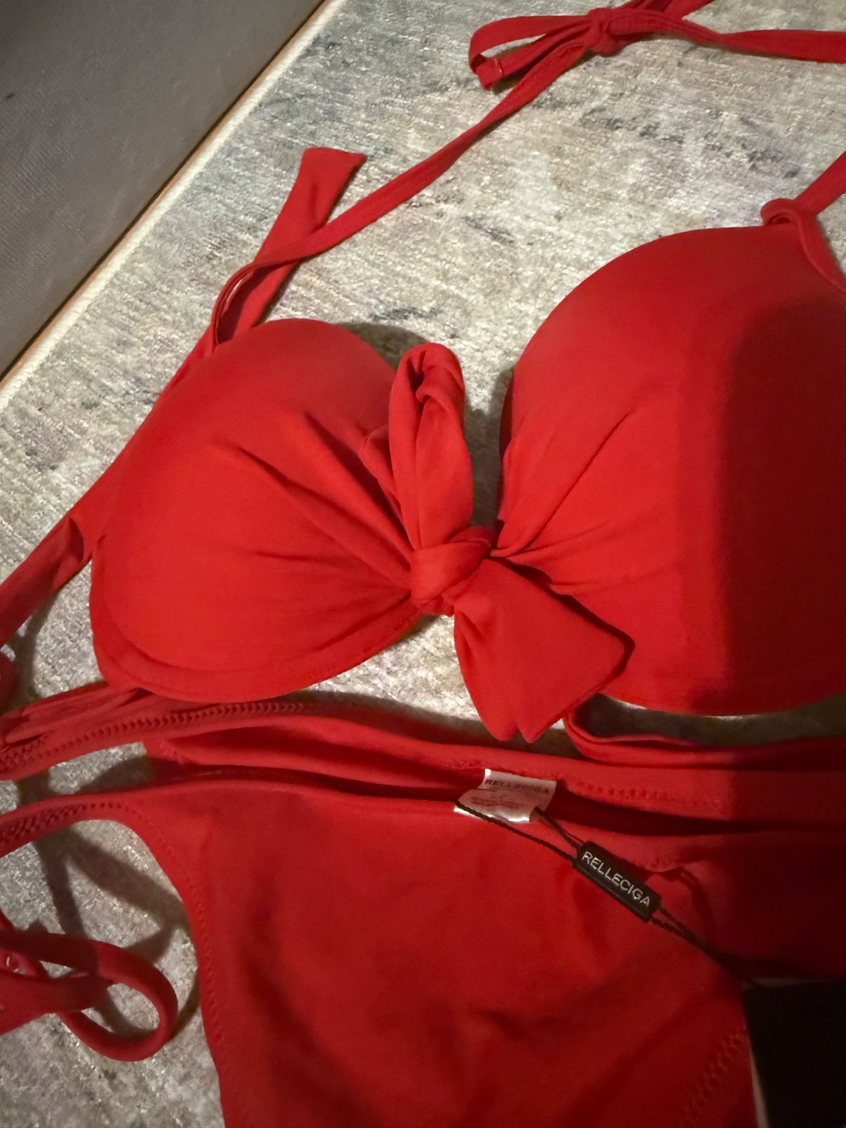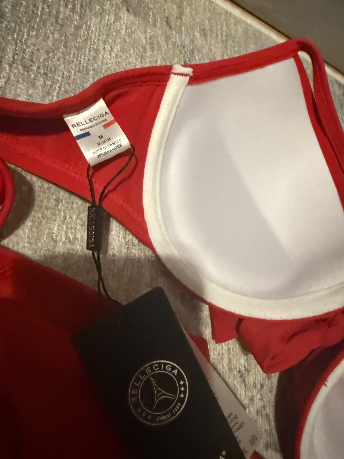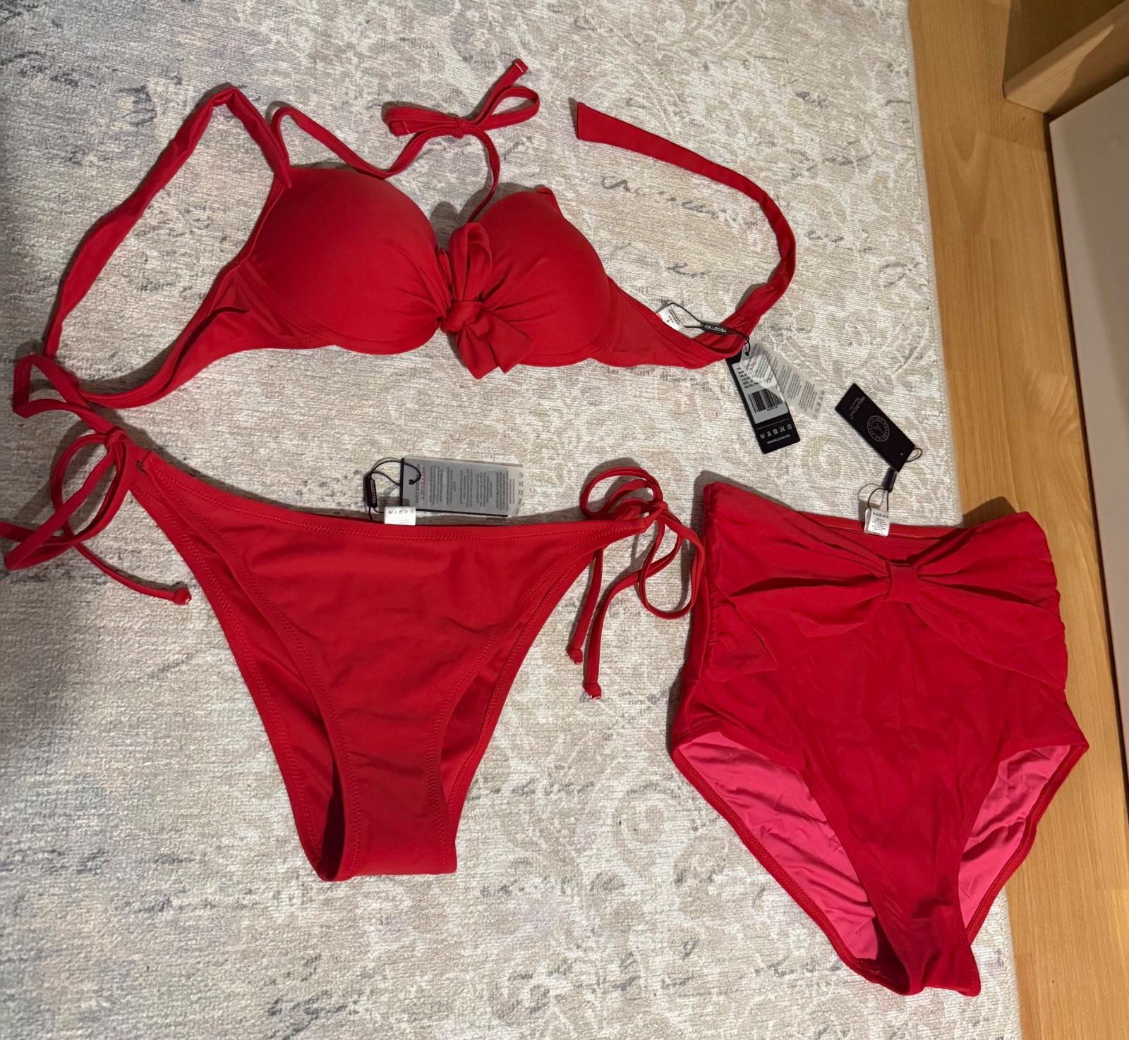 Málo nosené, v top stave. Krásna perleťová biela v kombinácii červeno modrej. Oblečené pôsobia krásne na postave, držia prsia a strih predĺži nohy. Spodok S , ale isto sadne aj na M. Vrch je M. Vyp...