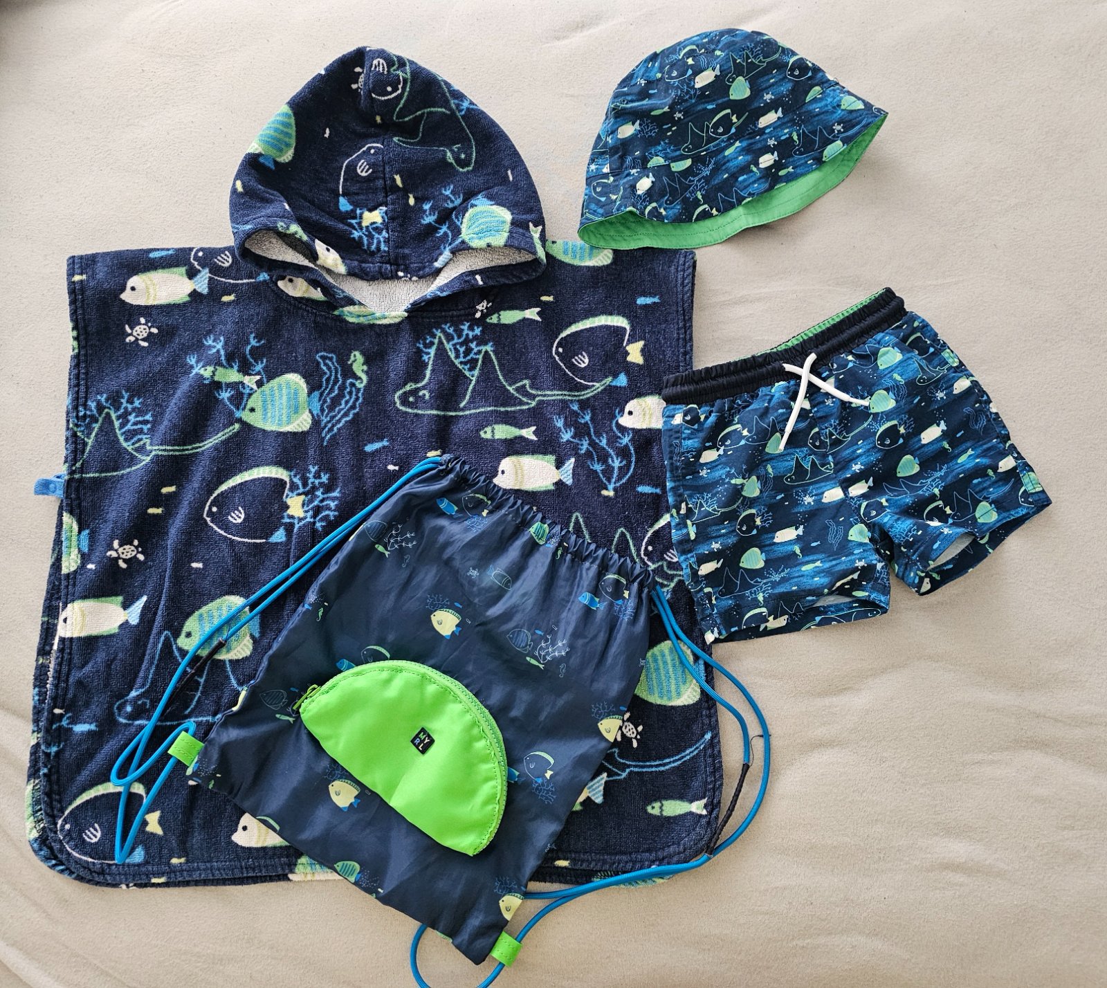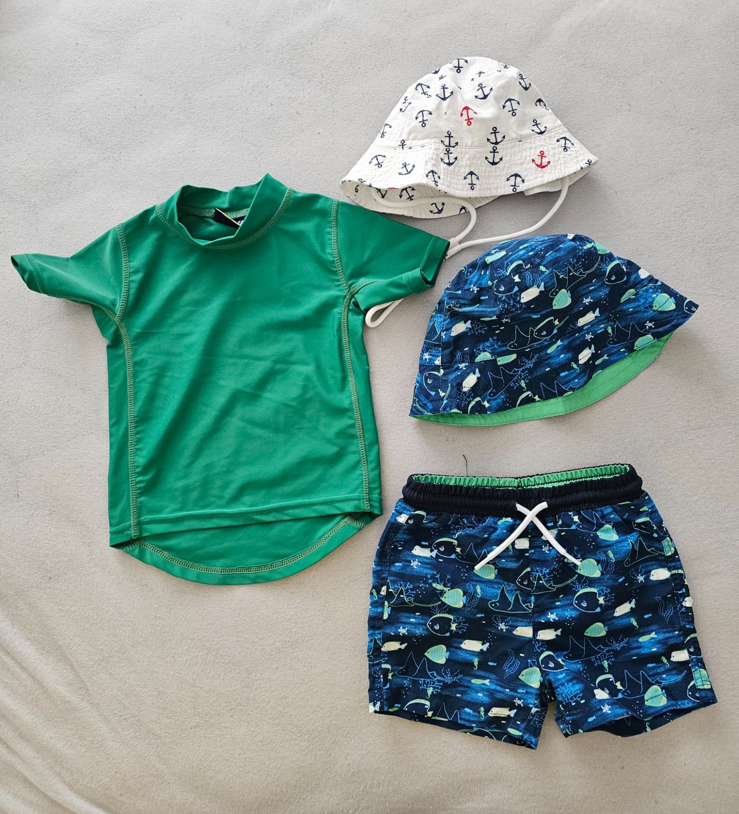 Krasna suprava mayoral zlozena z plavkovych sortiek, klobucika, uterakoveho ponca a vrecka. K tomu prikladam plavkovy vrch lupilu a este jeden klobucik. Velkost pisana 86,ale isto nositelne dlhsie. My sme mali ako 2-2,5r. Cena plus postovne.