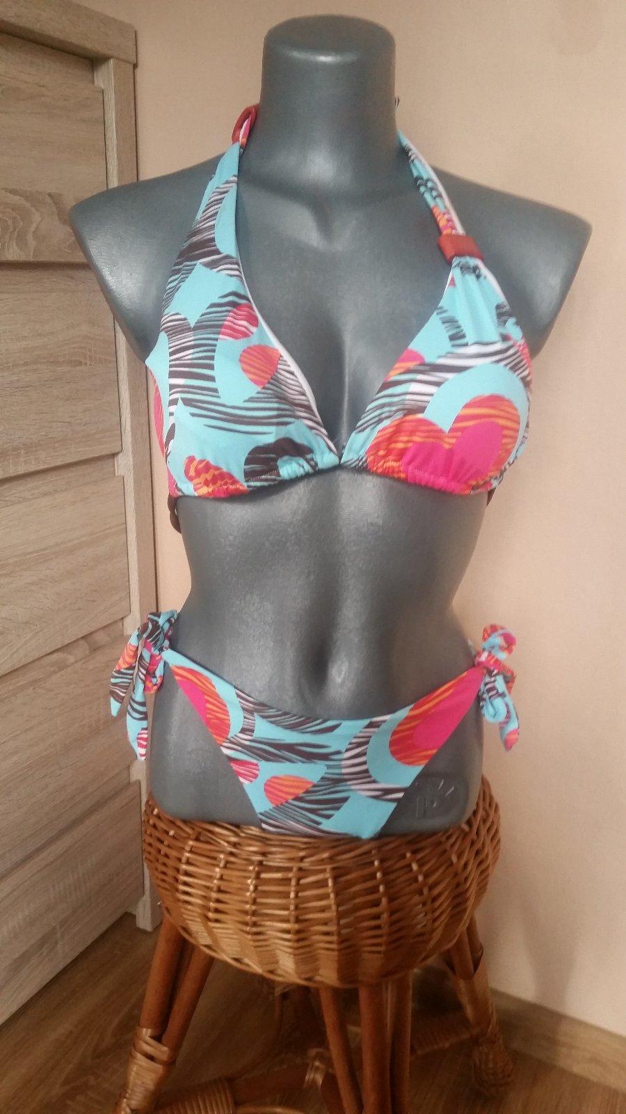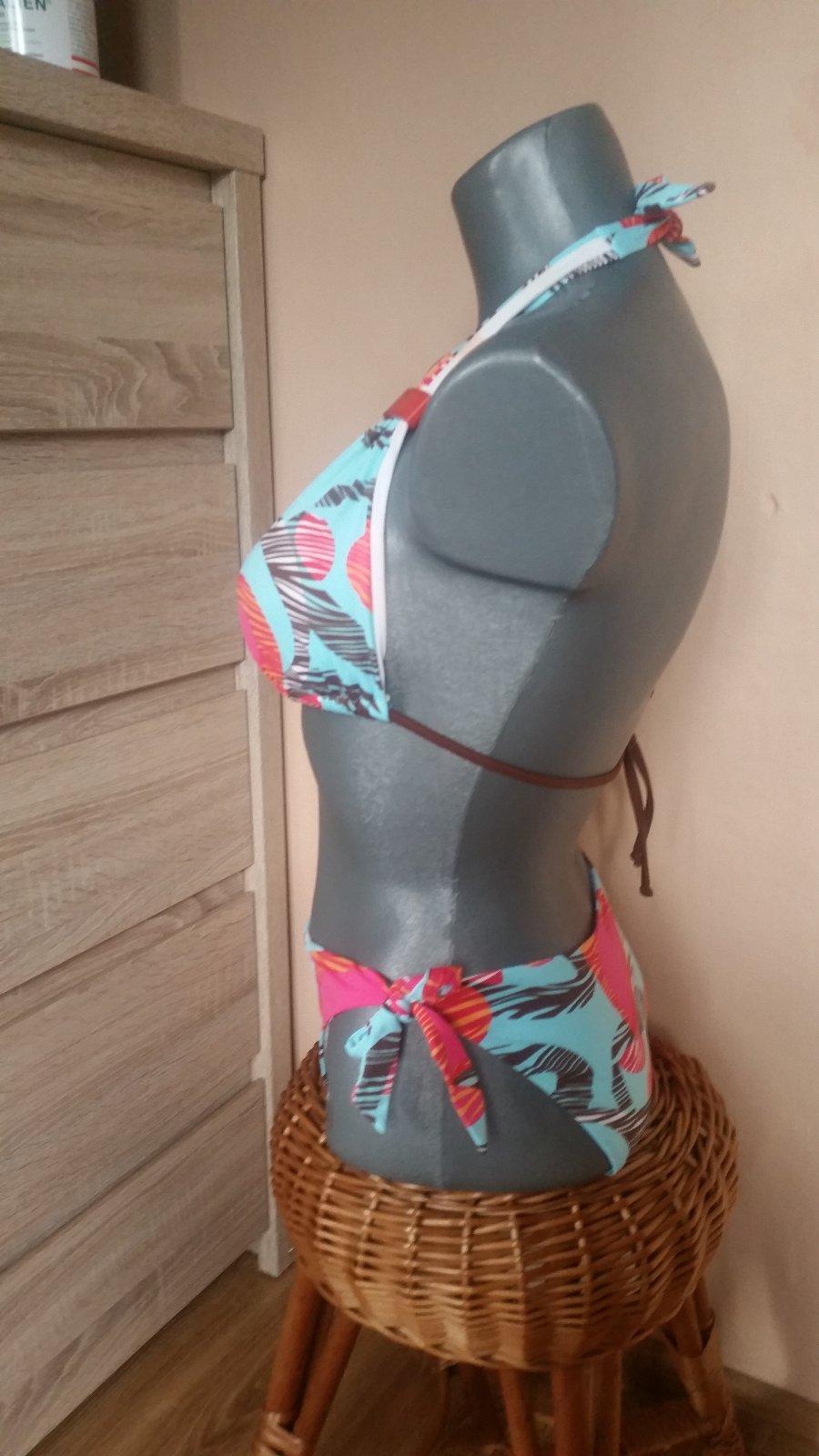 Dvojdielne trojuholníkové plavky, veľkosť 38. Vrchný diel je vystuženy s možnosťou odstrániť vankúšiky. Vo výbornom stave.