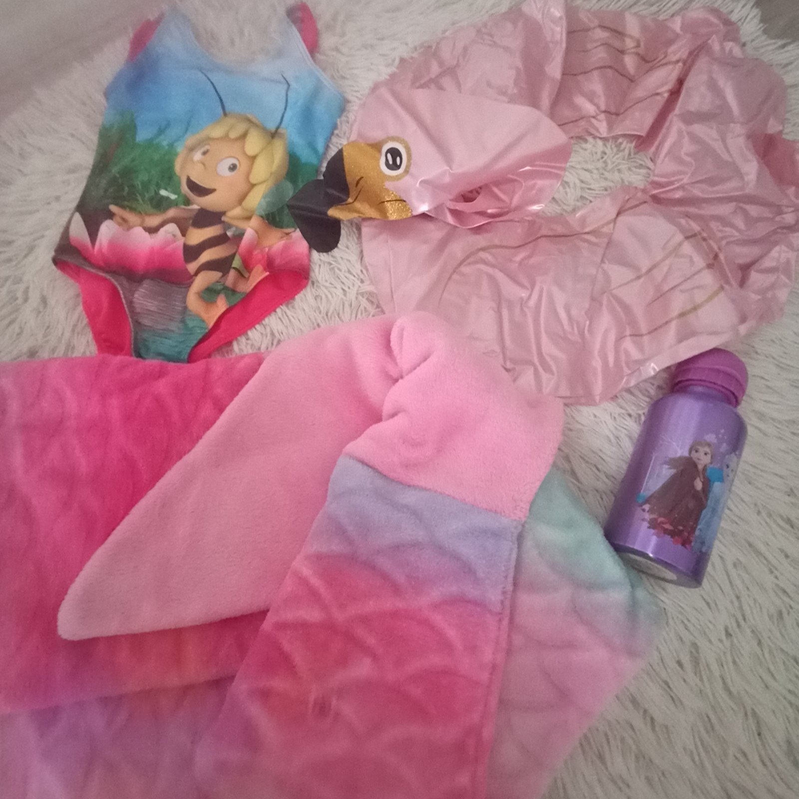 Fľaša,koleso Pelikan,deka morský chvost do ktorej sa dieťa zabali (vopchá do nej)