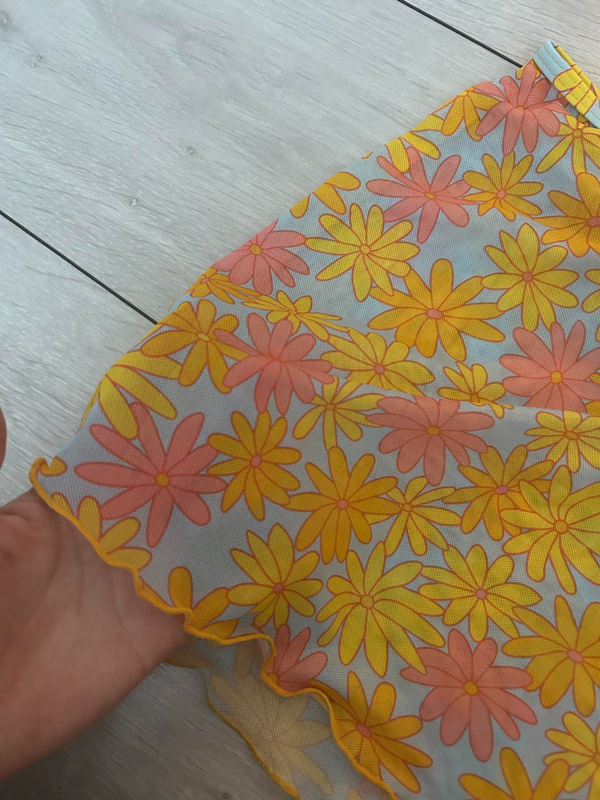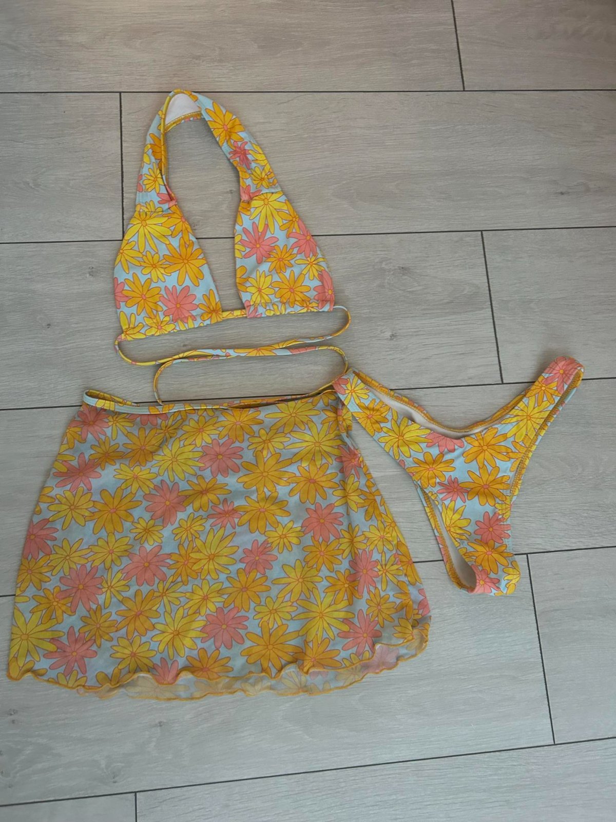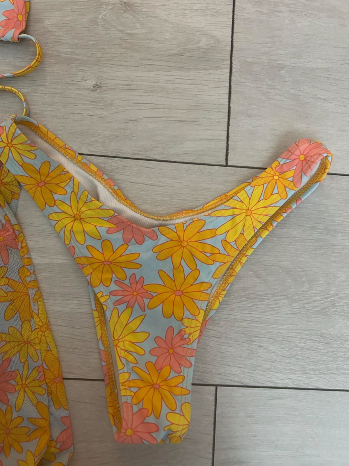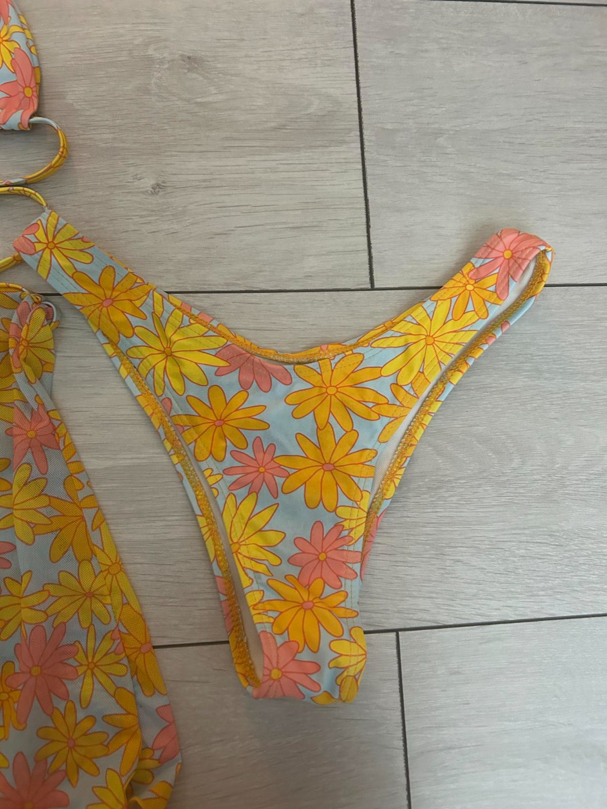 POZOR! Všetky plavky sú odfotené v spodnom prádle, čo sa týka spodnej časti. Taktiež niektoré z plaviek majú ešte aj ochranné nálepky. úplne nové plavky žltej farby s ružovými detailmi - veľkosť p...
