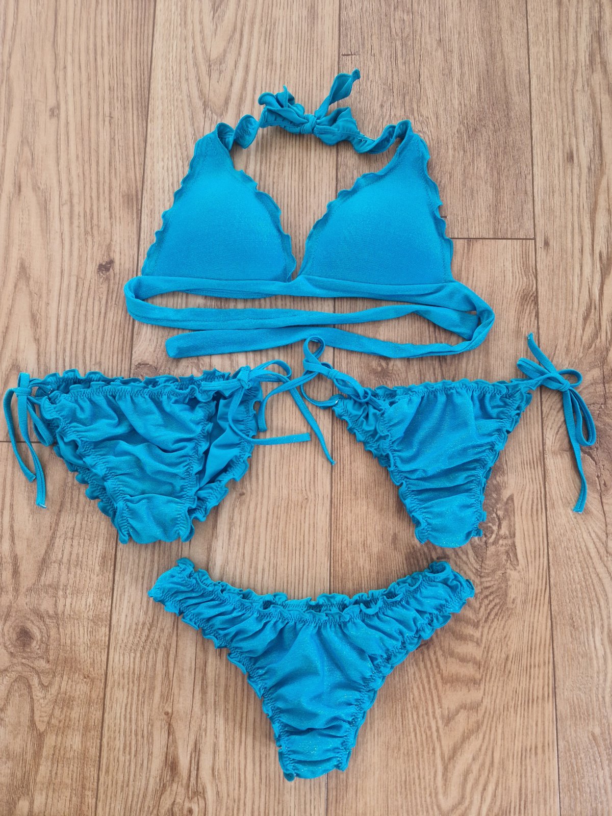Predam malo nosene plavky Calzedonia, velkost XS. Sada obsahuje vystuzeny trojuholnikovy vrsok, jedny klasicke a 2x brazilske nohavicky. TOP stav. Krasna trblietava tyrkysova farba.