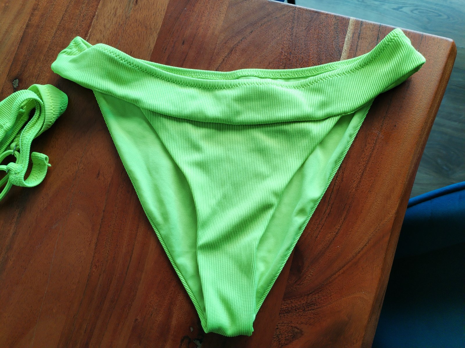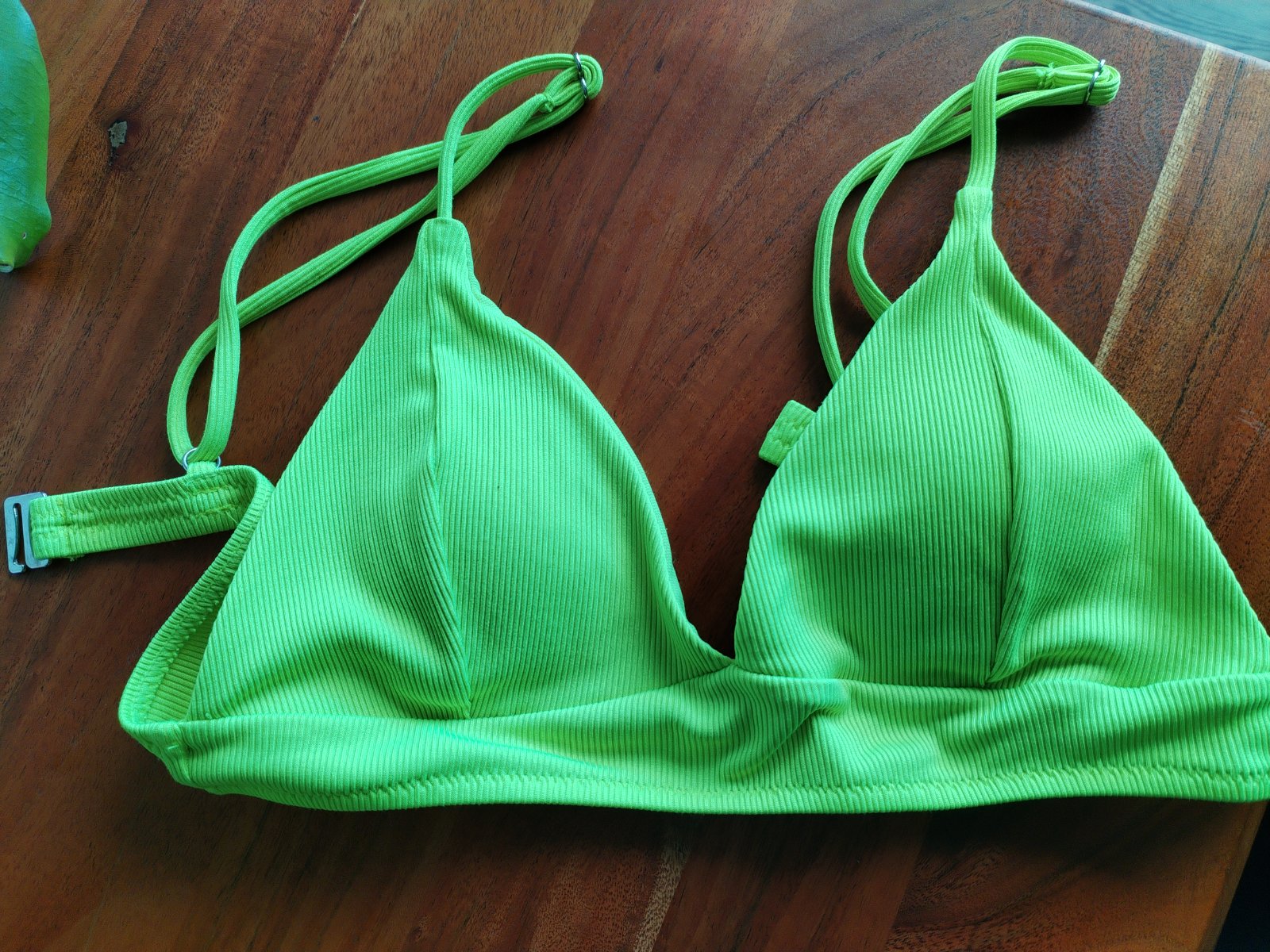 Plavky majú kriklavu zelenú farbu, bohužiaľ mi to telefón tak pekne neodfotil, dcéra ich nosila jednu sezónu,odstrihla lístky,ale nosila veľkosť 36 a košíky B, ramienka sa dajú nastaviť. Cena 4 eura plus posta