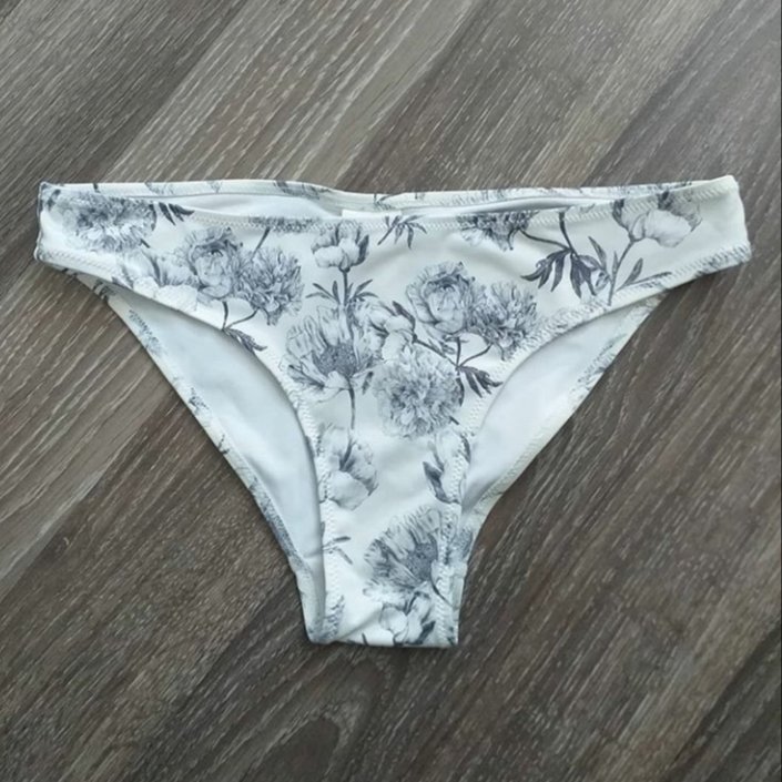 Plavkové nohavičky, veľkosť 34 Podklad biela farba s kvetinovou modro-fialovou potlačou Cena 4€ + poštovné