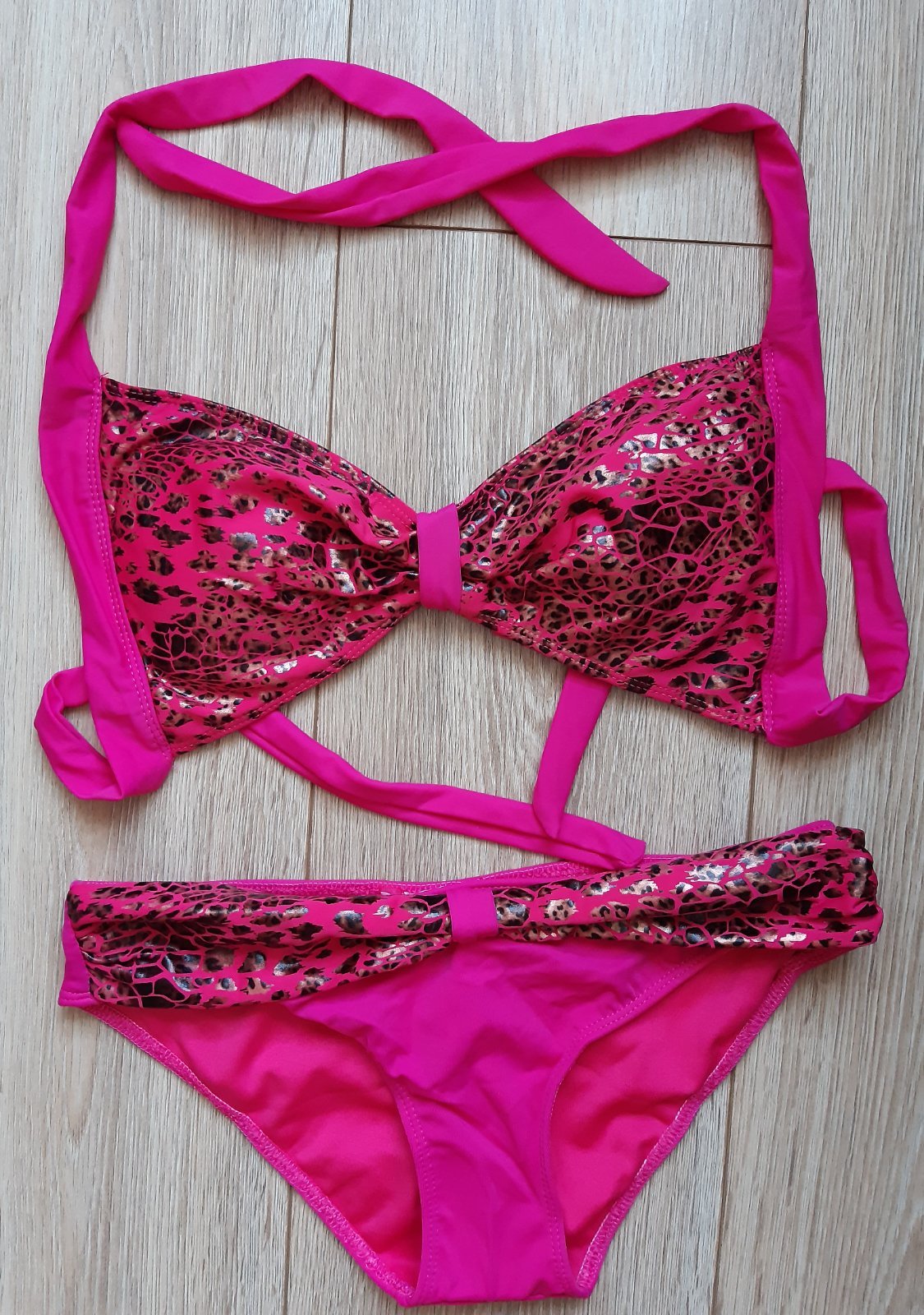 Predám dievčenské plavky, dvojdielne, ružovej farby so zlatými fľakmi, veľkosť píšu 13-14 rokov.