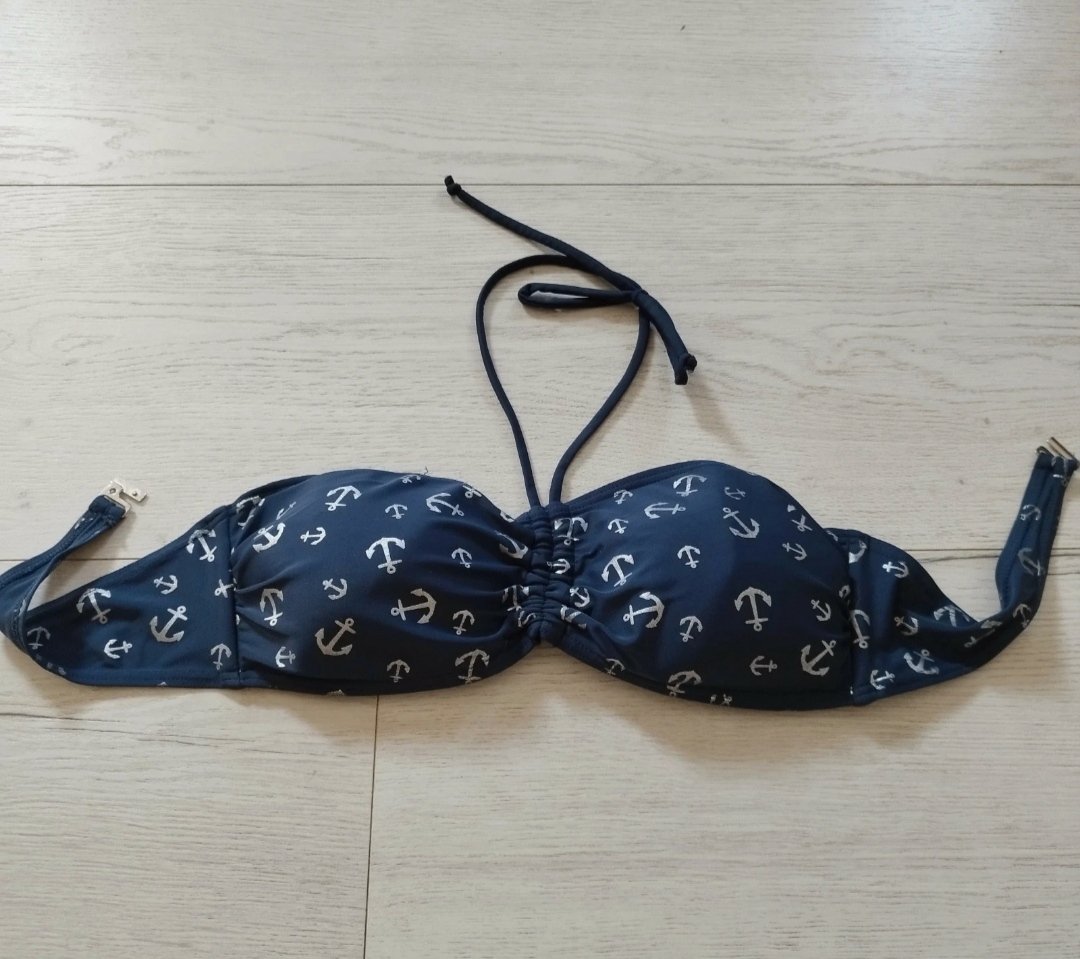 Vrchná časť raz vyskúšaná, dolná nenosené. Podšitá vystužená bikinová podprsenka s nastaviteľnými ramienkami a košíkmi bez kostíc s vyberateľnými vypchávkami, ktoré tvarujú a poskytujú dobrú oporu....