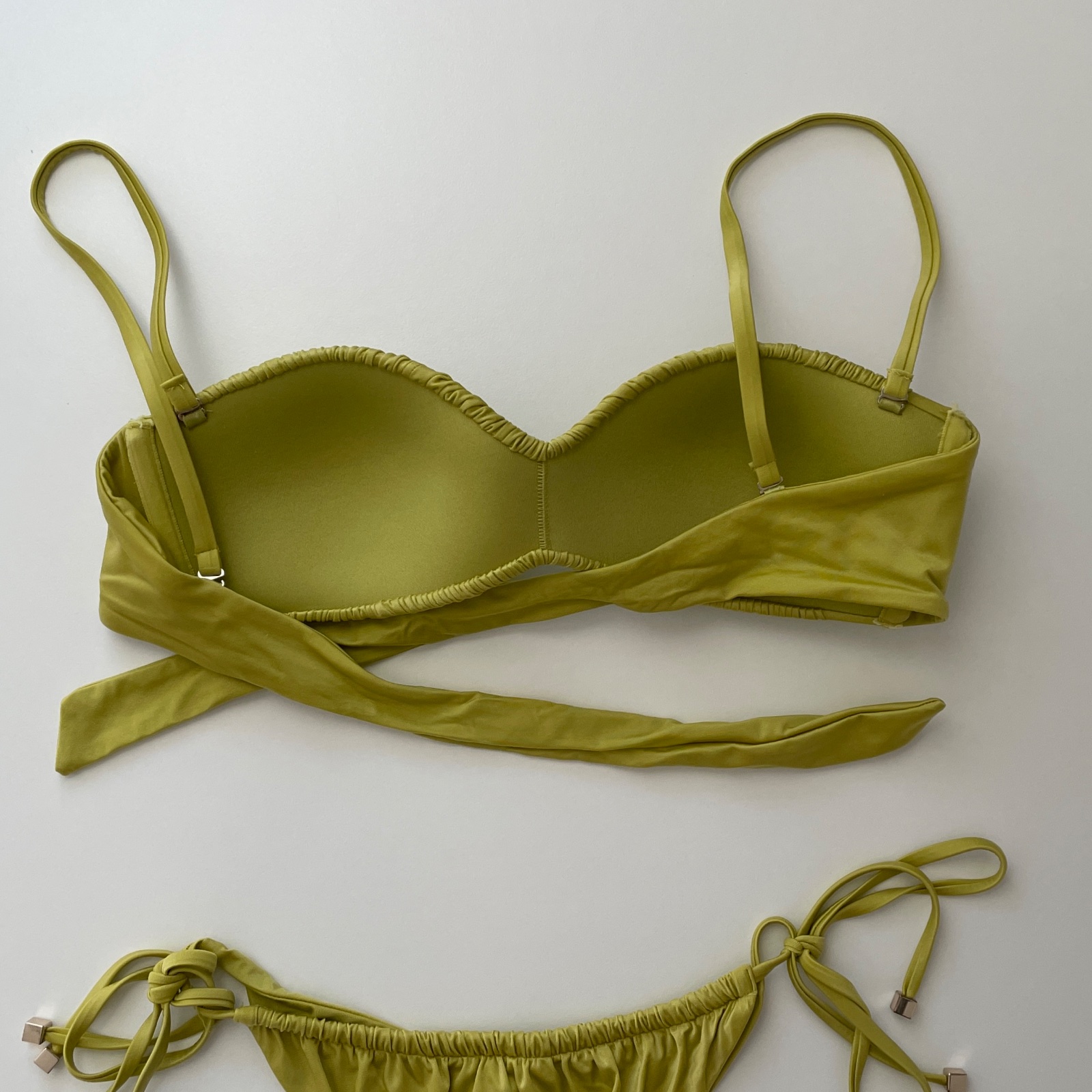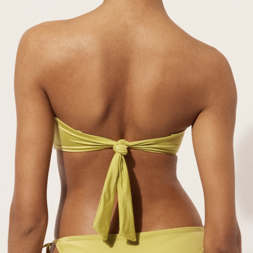 Predám svetlozelené bikiny - bandeau vrch veľkosti S a spodok brazílskeho strihu veľkosti XS. Málo nosené, bez poškodenia.