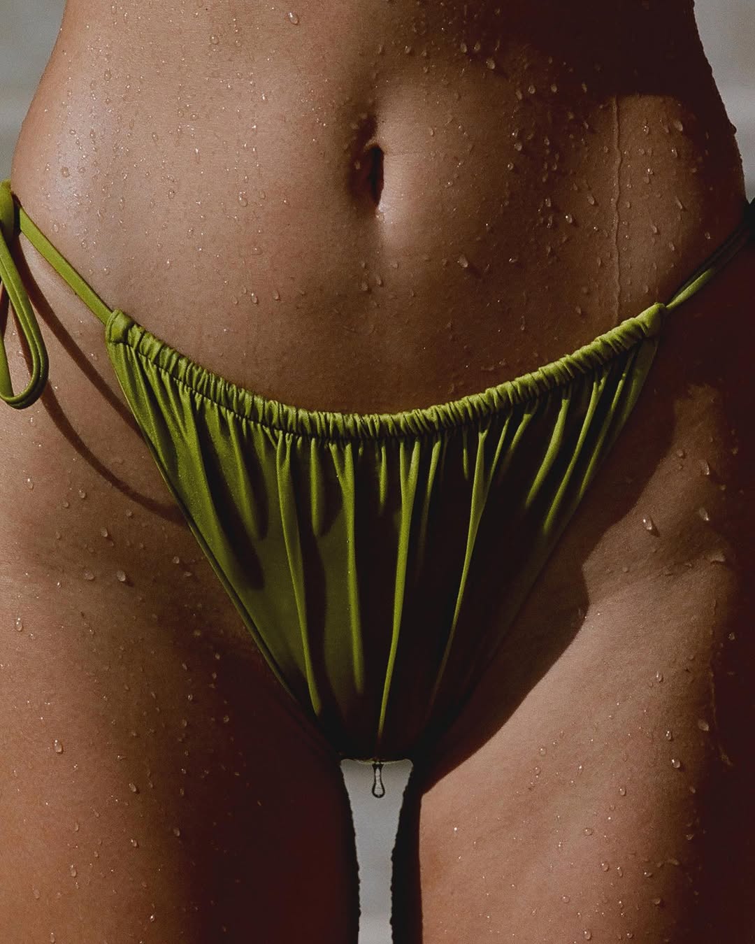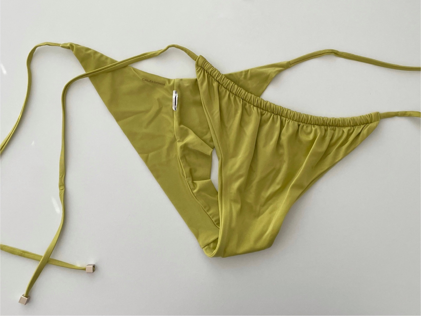 Spodný diel bikín brazílskeho strihu so zaväzovaním na tenké šnúrky na bokoch, kompletne podšitý, neviditeľné švy. Ozdobné detaily v podobe riasenia a koncoviek zlatej farby.
