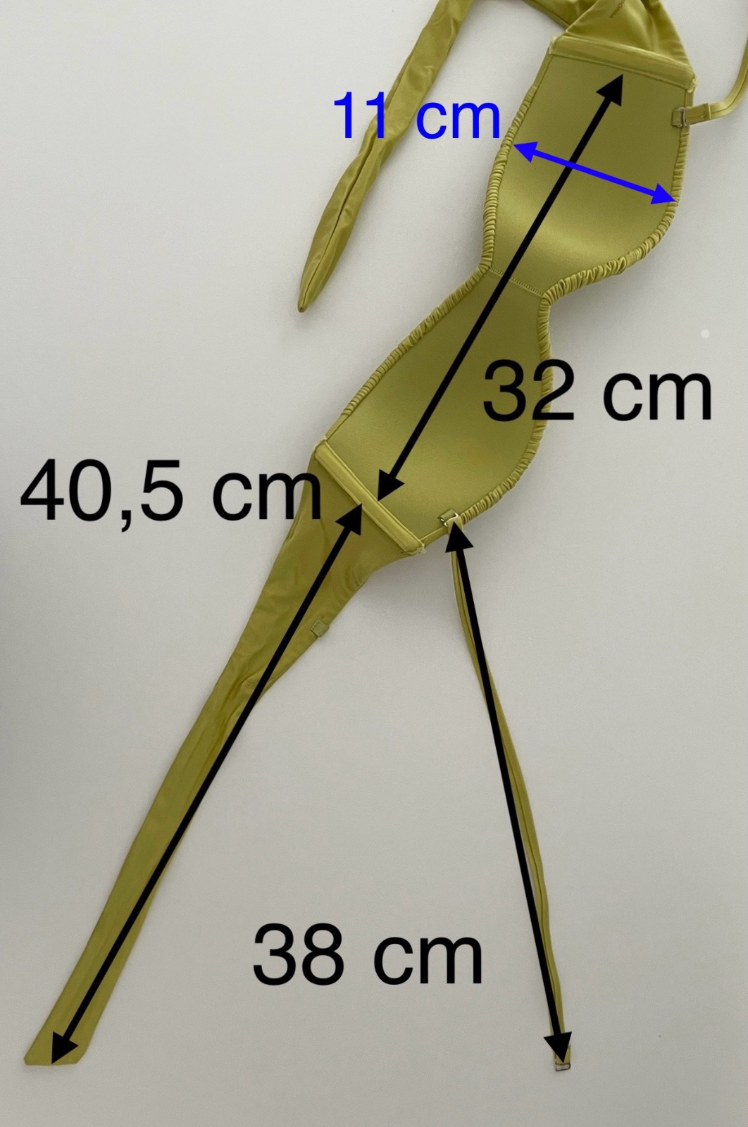 Pásový vrchný diel bikín s košíčkami s odstupňovanou výstužou, kosticami a bočnou výstužou pre lepšiu podporu. Ozdobný detail v podobe riasenia, nastaviteľné a odnímateľné ramienka, zaväzovanie vzadu na mašľu.
