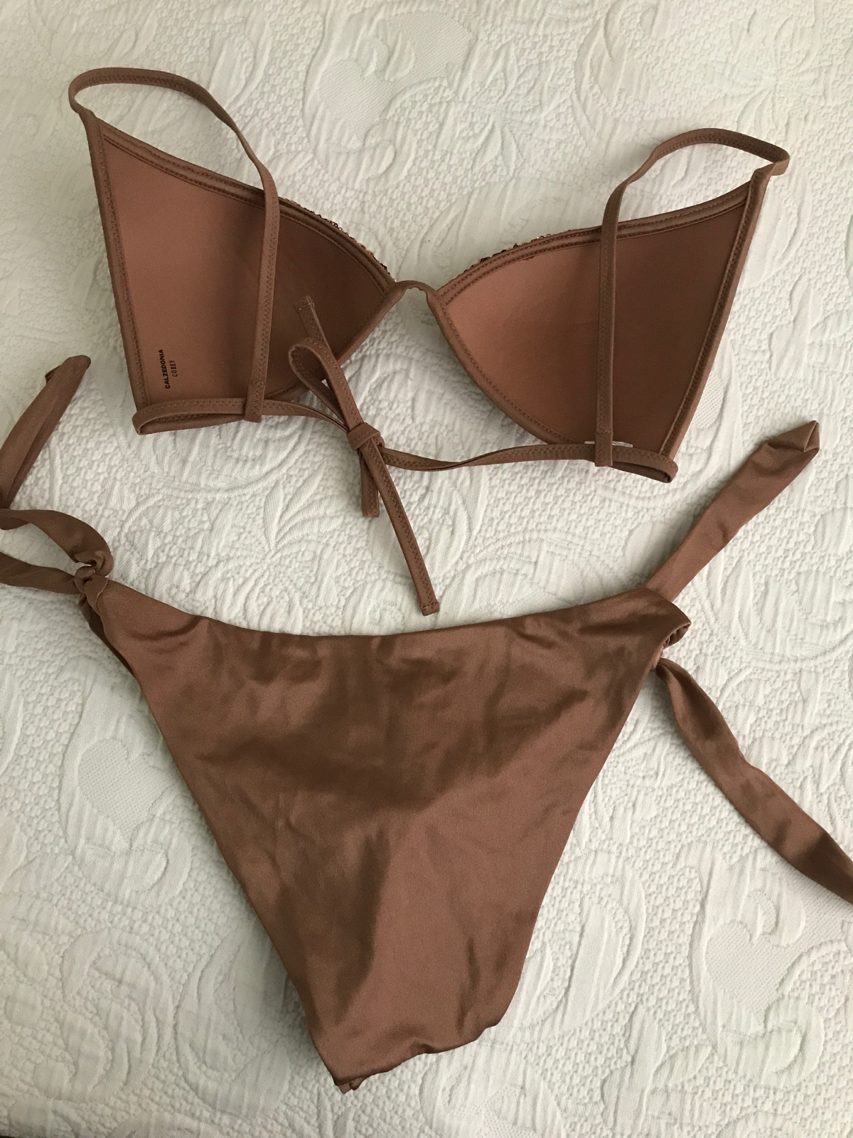 Neskutočný materiál. Kvalitný dráhy model. Nohavičky brutálne pekne vykrojene a obsite niťou čiernou veľkosť M. Vrch vzadu na uvazovanie takže obvod si regulujete veľkosť L cize v calzedonii ako 4....