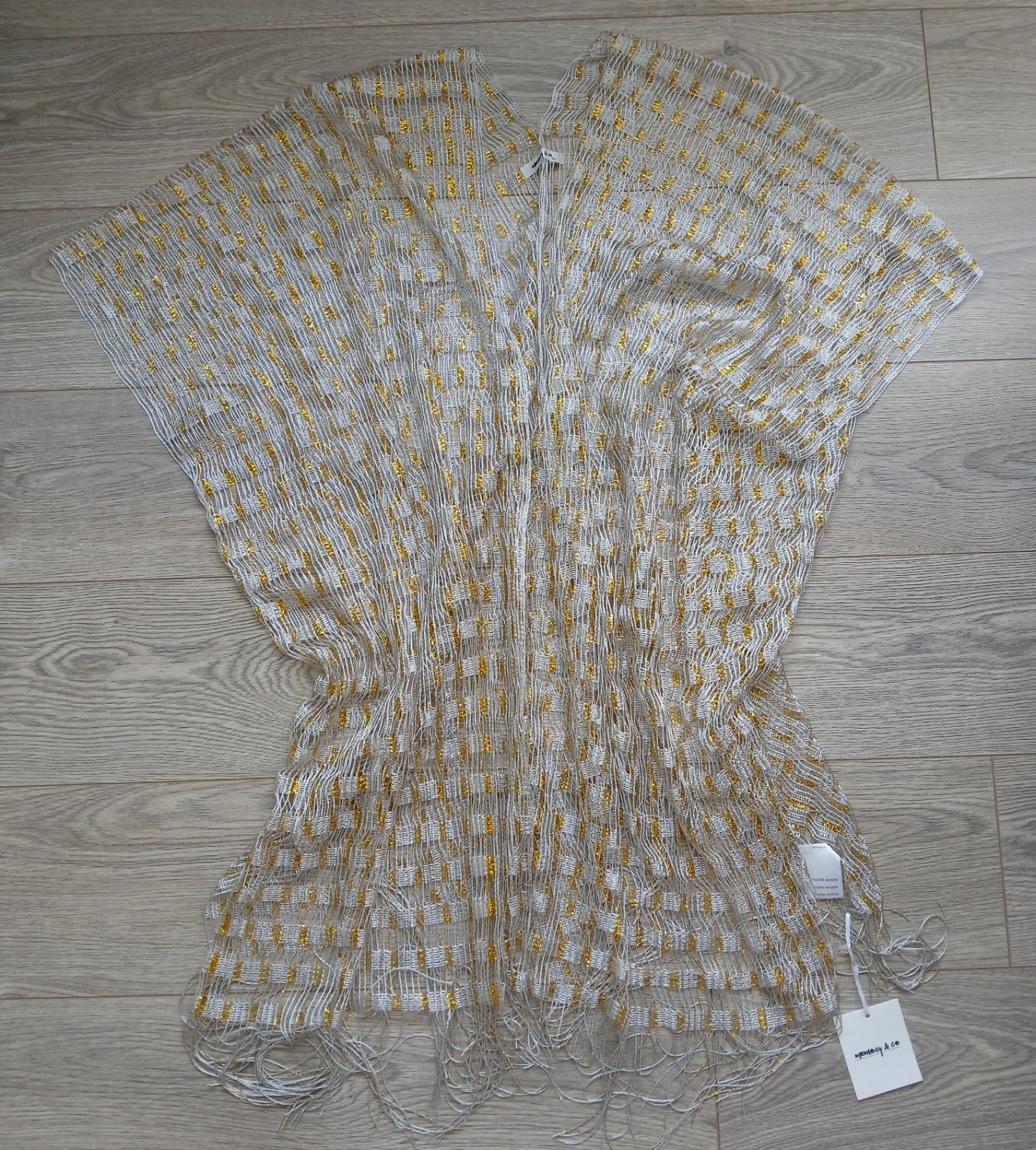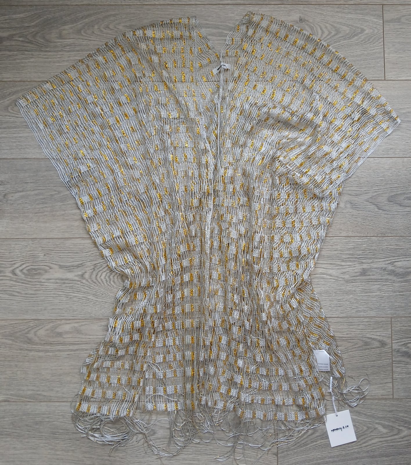 raz oblečený plážový prehoz na plavky, ozdobne pletený, na BOHO štýl, ozdobná, voľná väzba s trblietavým zlatým prešívaním, ľahký oversize model s ramienkami, mierne elastický, dlžka 97cm