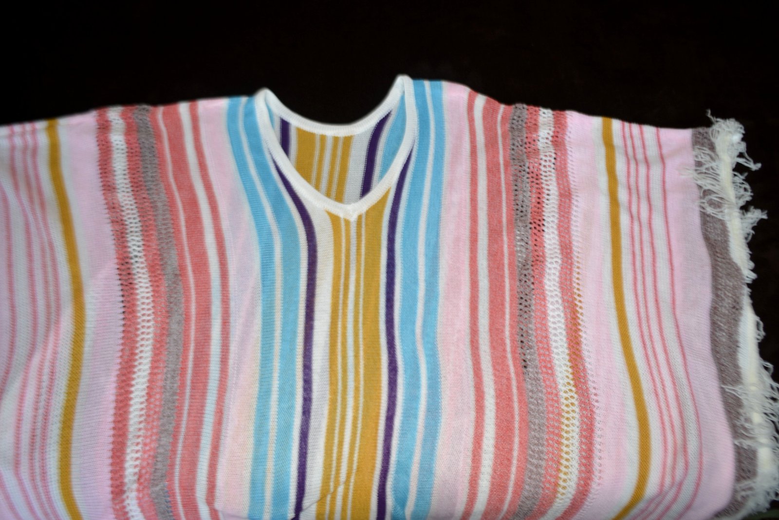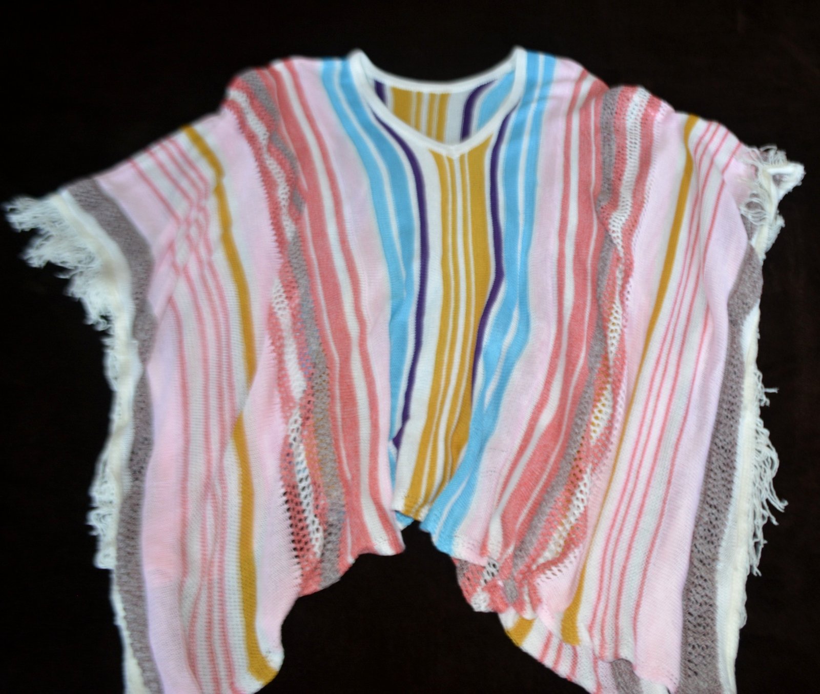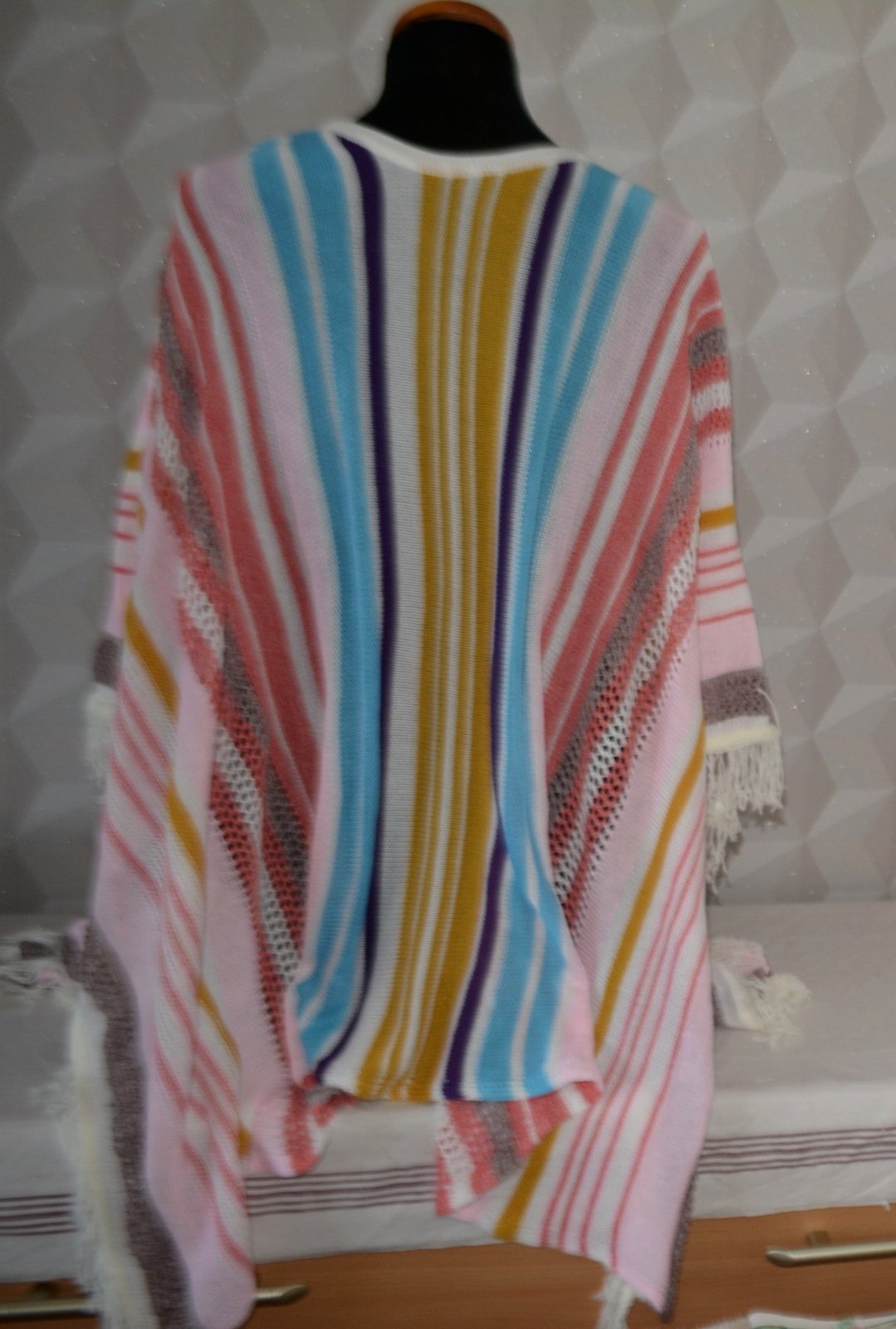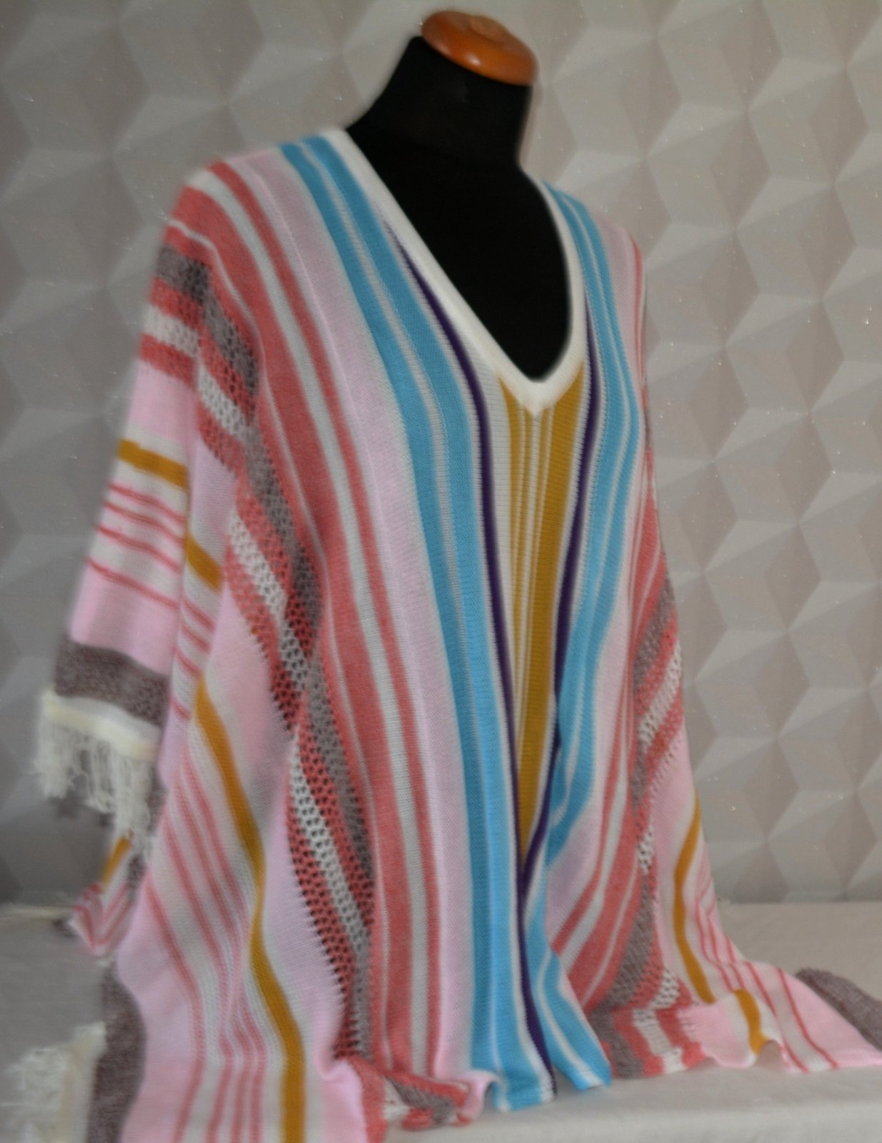 bikinové pončo, výstrih do V, netopiere rukávy, bočný rozparok, strapcová výzdoba, s farebnými ozdobnými pruhmi, voľný strih