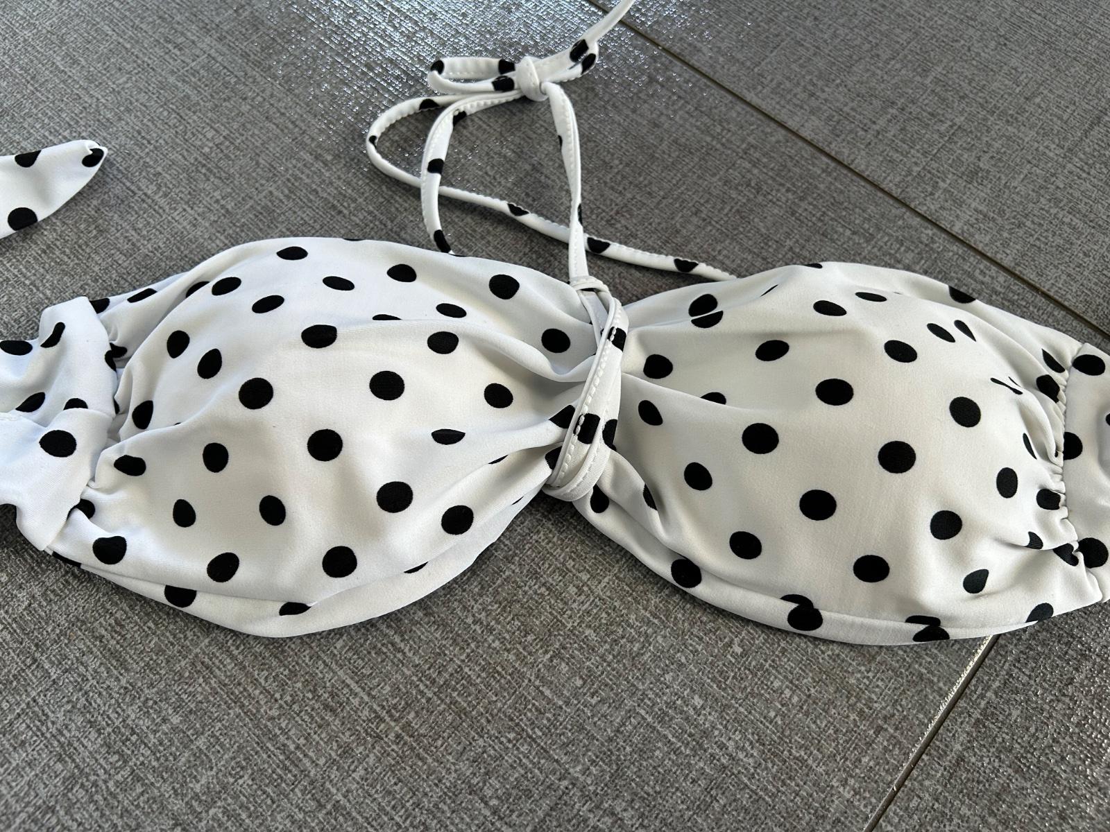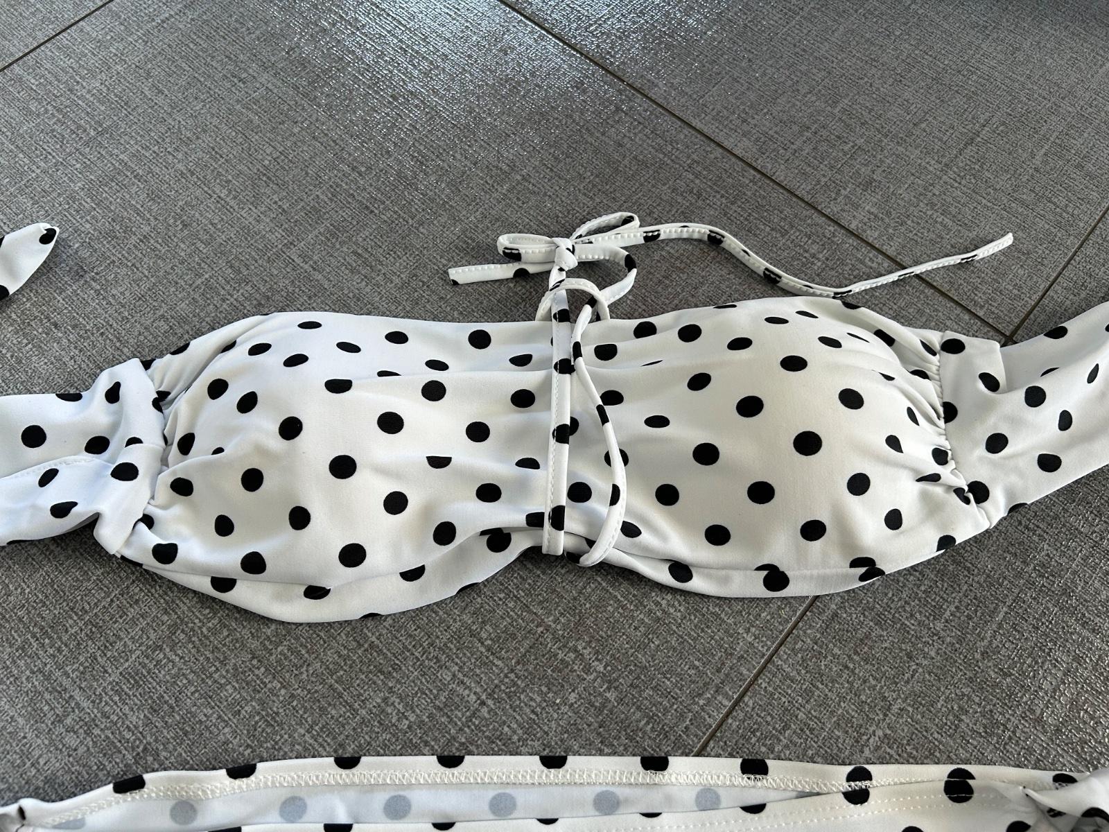 v tomto farebnom prevedení iba 1 ks- perfektne sedia a vyzerajú super- biely podklad s čiernymi bodkami. Spodok plaviek na bokoch na zaväzovanie, čiže nastavite podľa potreby. Podprsenka plaviek je vystužená košíkmi a hlavne obojstranná- veľkosť nastavíte tym, že pretočíte v strede jeden alebo dvakrát, v prípade potreby neprekrížite vôbec, iba stiahnete šnúrkou okolo krku. Kvalitný elastický materiál, Doporučujem veľkosť S-L. Kupované v zahraničí.