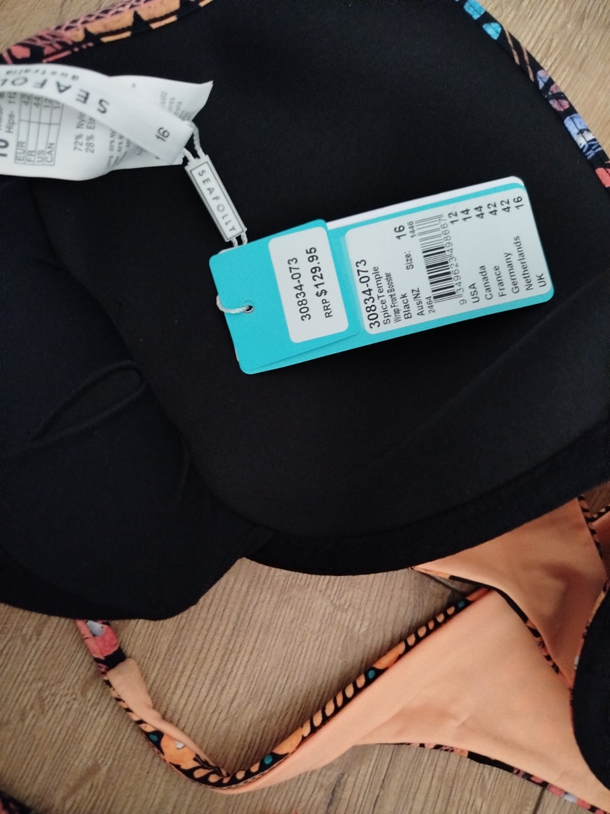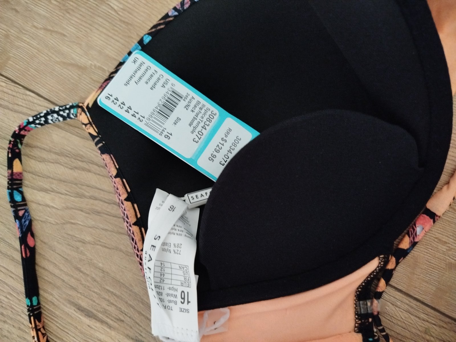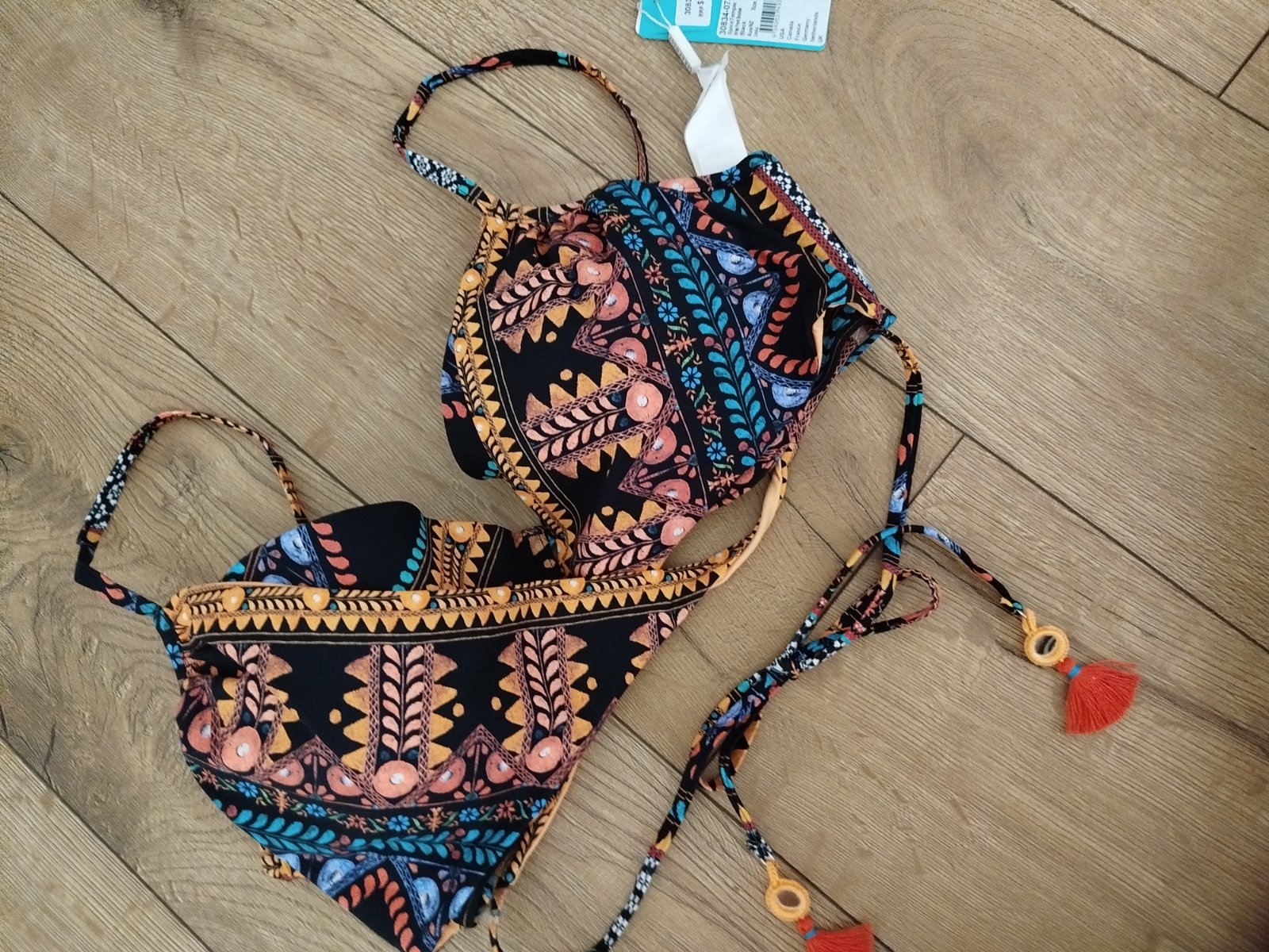 Úžasné nové plavky horný diel značka seafolly veľmi zaujímavo riešené predná časť sa viaže okolo brucha tam sú aj dekoračné šnúrky vystužená vypchavky sa dajú vybrať veľkosť 42 ale sedia skôr na veľkosť 40 šírka je 77cm +zapínanie košíček B menšie C