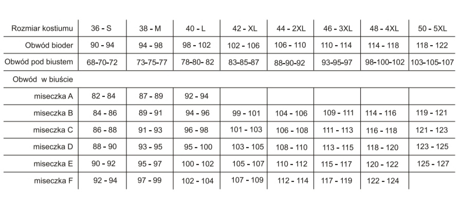 Obvod bokov: S: 90-94, M: 95-100, L: 101-108, XL: 110-116, XXL: 117-122, 122-127.