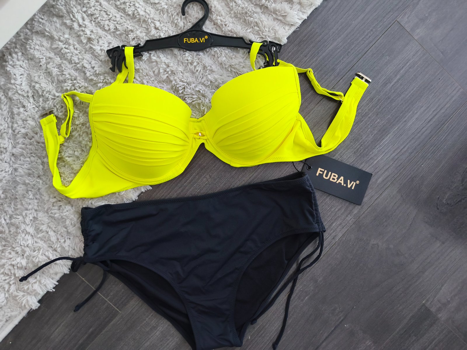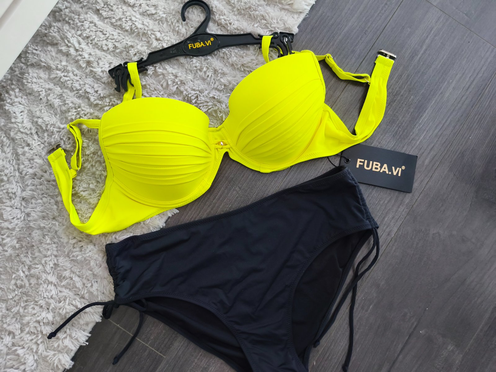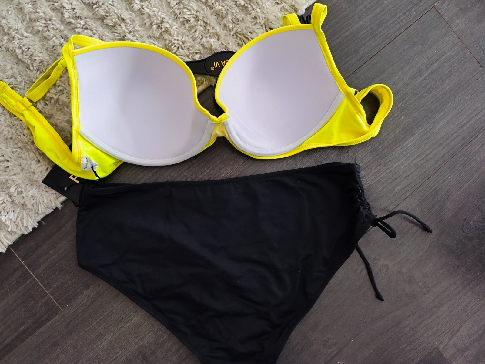 Vystužená podprsenka s nastaviteľnými pevnými ramienkami. Nohavičky klasického strihu stredne vysoké na bokoch šnúrky.