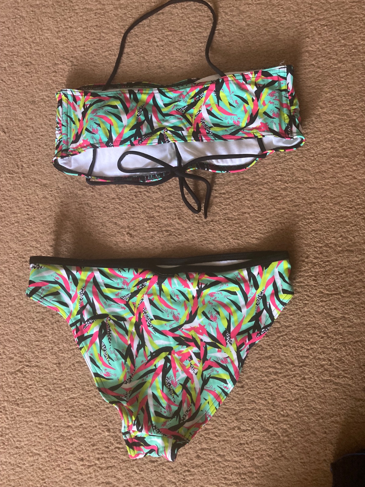 Predam krásne dvojdielne plavky. Vrchny diel sa zaväzuje ceznkrk a potom po obvode hrudníka. Obvod hrudníka 68 cm a dá sa natiahnuť na 78 cm. Obvod spodného dielu je 70 cm a dá sa natiahnuť na 80 cm. Cena + poštovné.