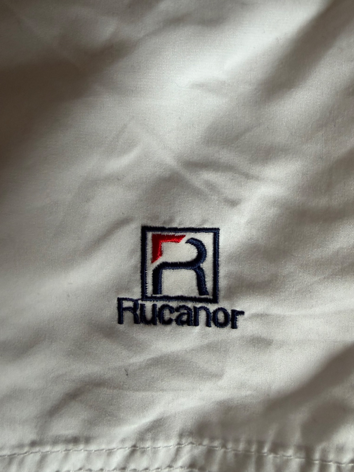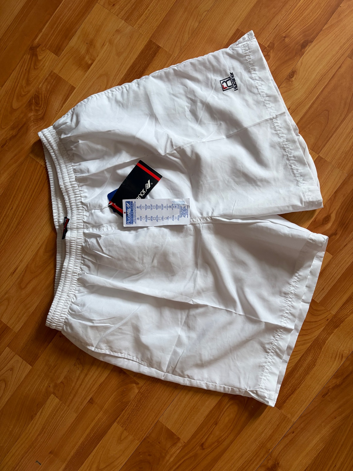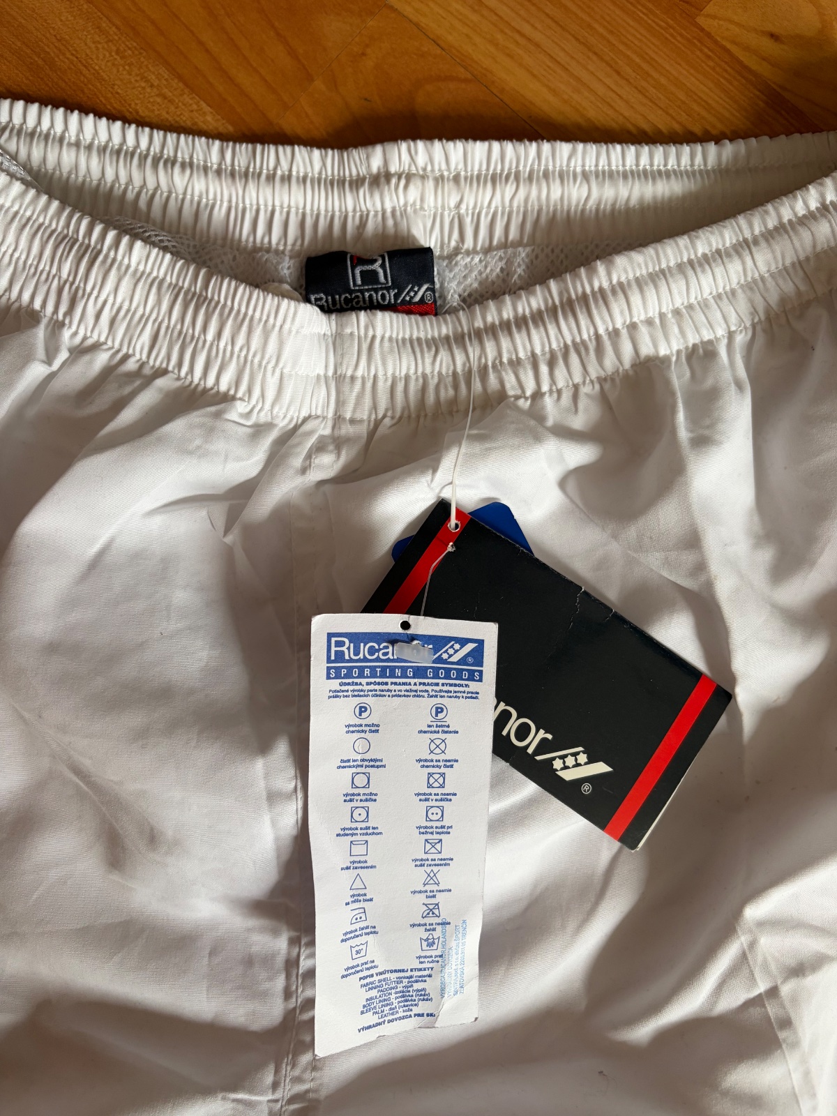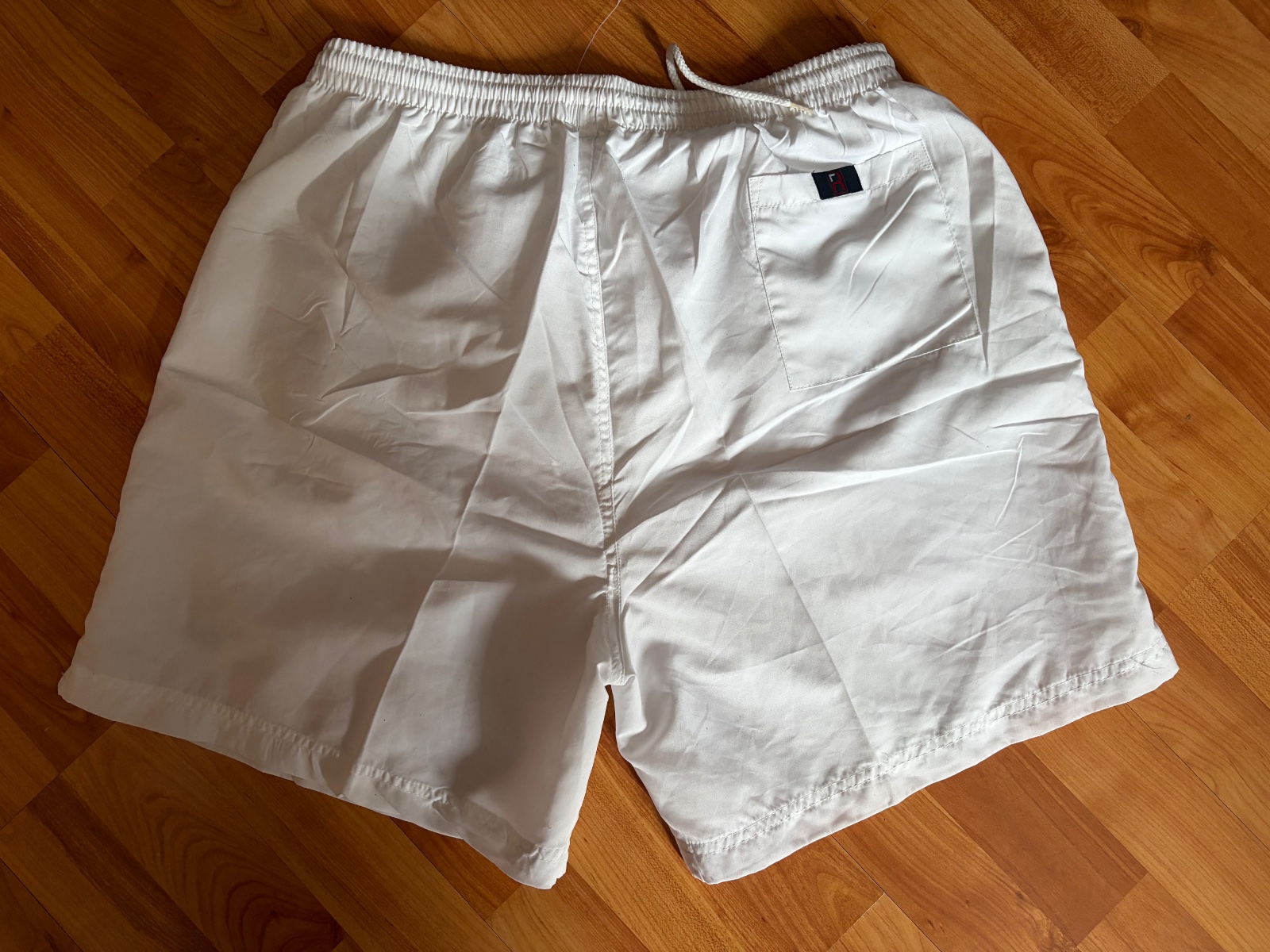 biele plavky s farebnými pásmi na bokoch, dovezené z Kuby, podšité sieťkou, v páse suchý zips a šnúrka, na boku vrecko. Rozmery: dĺžka 56 cm, pás 82cm Značka: S CUBA