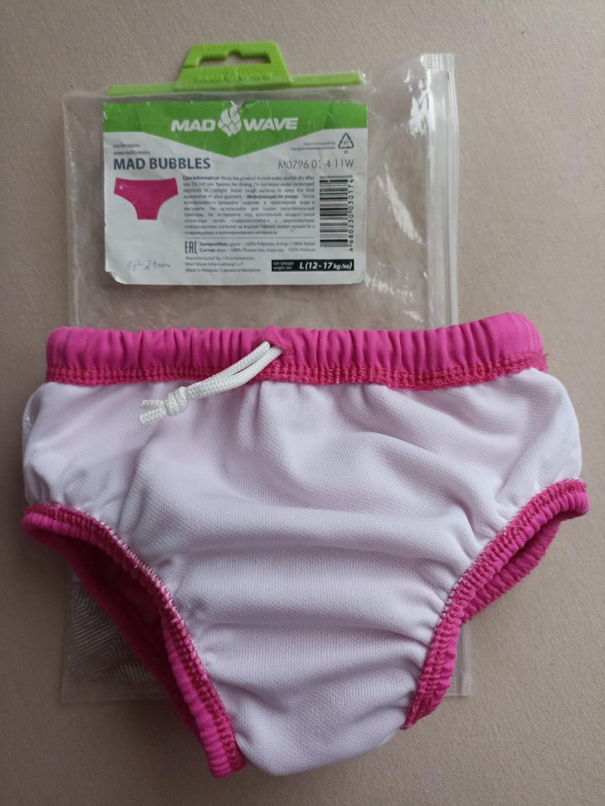 Predam prilezitostne pouzite detské plavky s plienkou znacky Mad Bubbles. Pouzite boli asi 3x (nosili sme ich ako druhe nahradne plavky do bazena) Velkostou su pre deti 18-24 mesiacov, tak do 13 kg. Na obale sa pise velkost L (12-17kg), ale dcerka ich mala na sebe pri vahe 12.5kg a boli jej tesne, takze su skor pre velkost M. Mozem ich premerat v pripade zaujmu. Sú vhodne na kupanie v bazenoch . Ich podšívka je z veľmi jemnej polyesterovej tkaniny, ktorá je šetrná k citlivej detskej pokožke a spoľahlivo absorbuje nečistoty, ktorým bráni prenikať do vody.