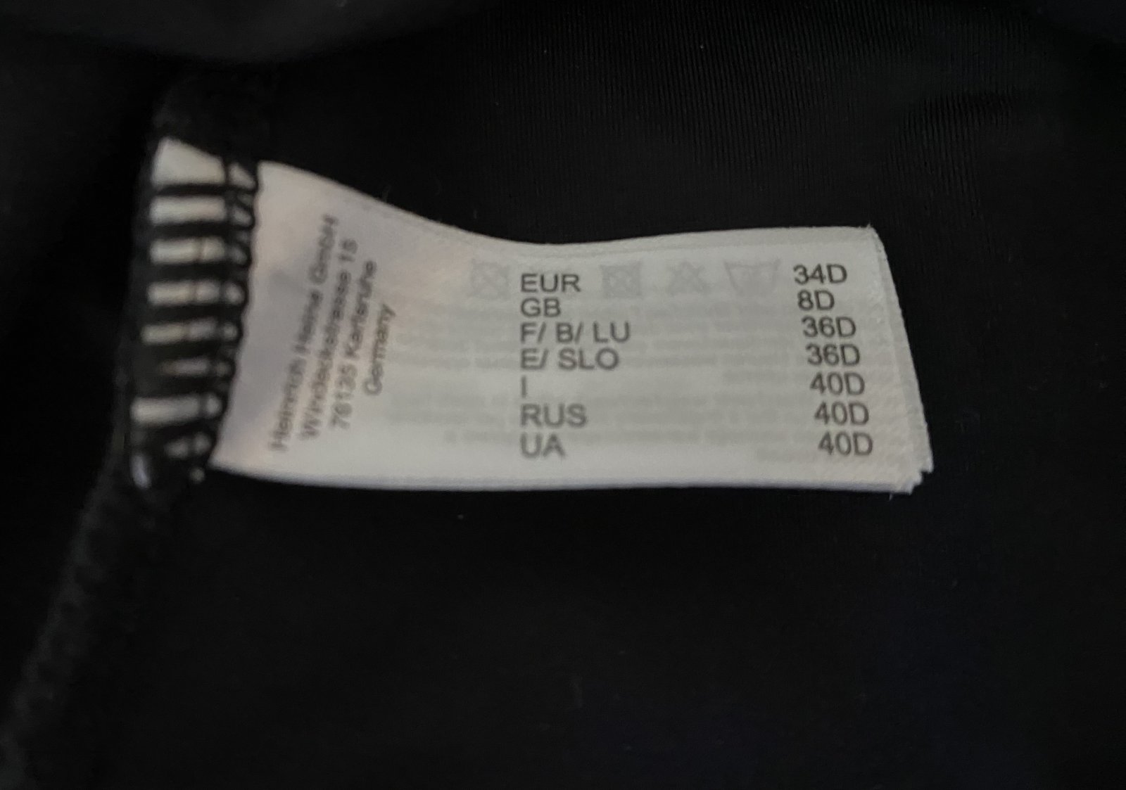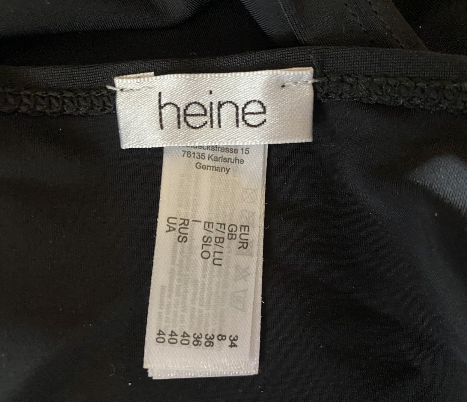 Nenosené, iba opraté zoštíhľujúce plavky - tankiny HEINE v. 34, materiál polyamid + elastan, základná farba čierna + biela + zelenkavá, podprsenková časť vpredu 2 vrstvy, z vnútornej strany mäkké vycpávky, odnímateľné ramienka.
