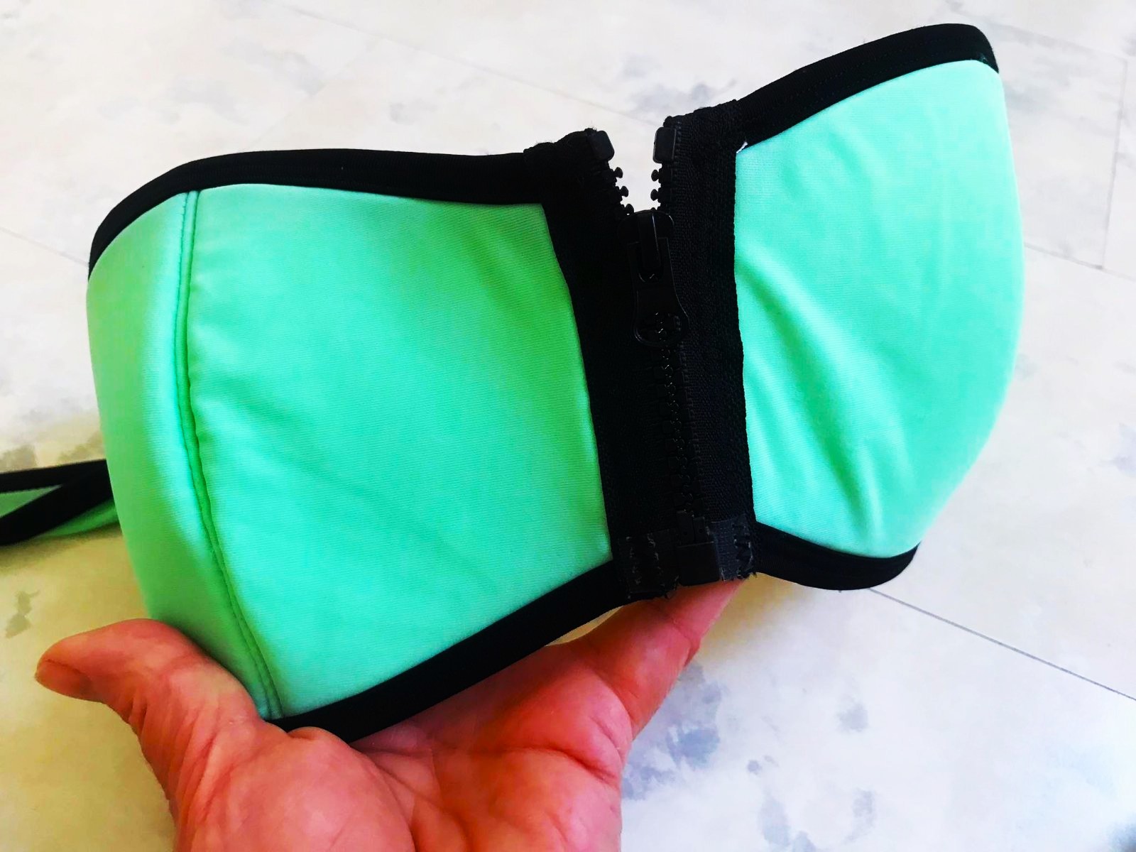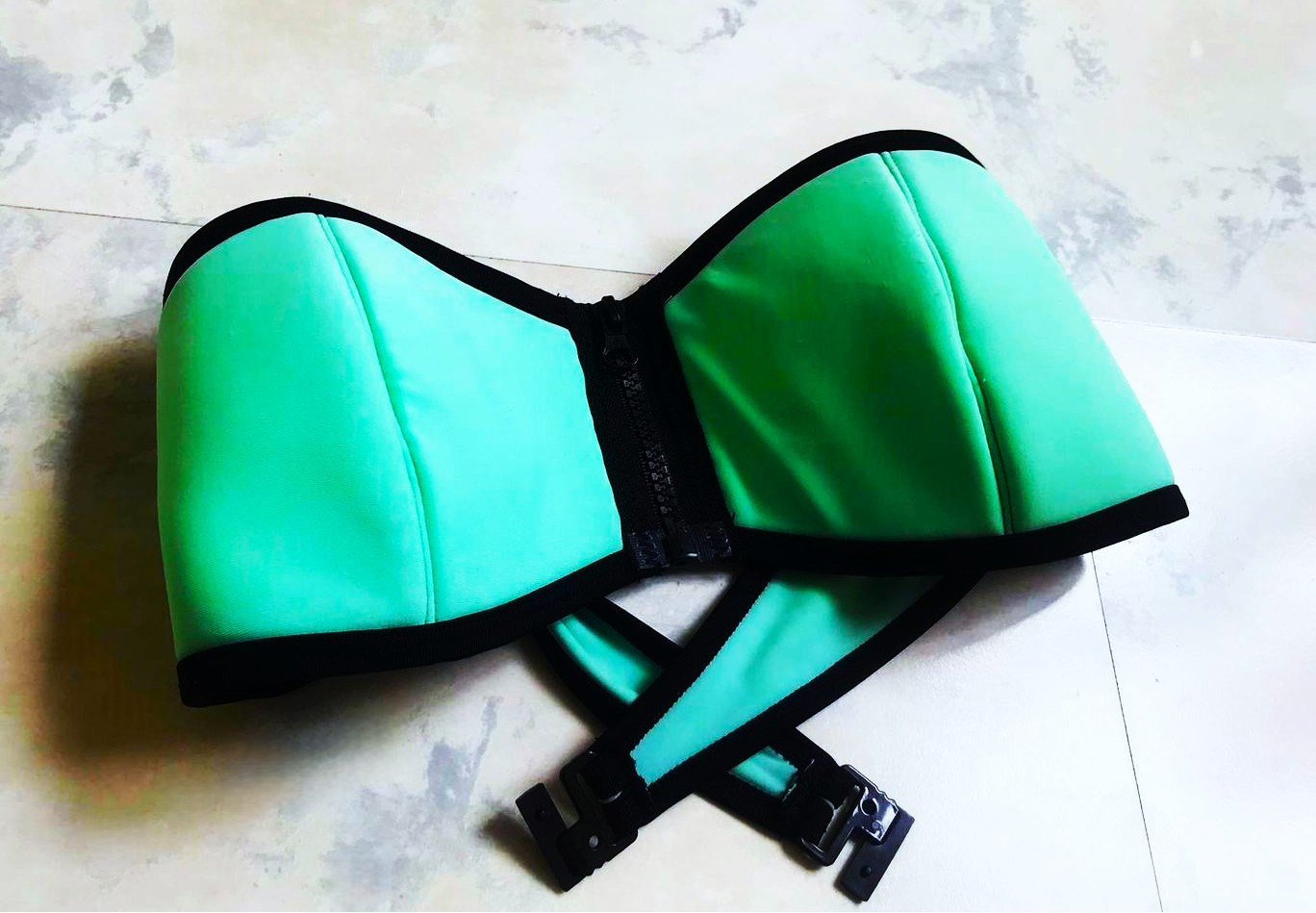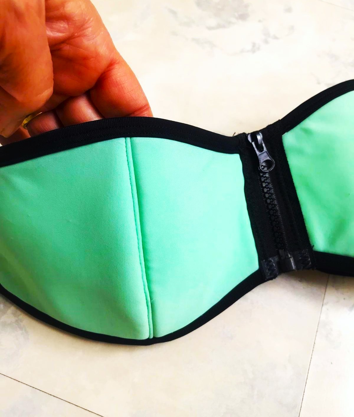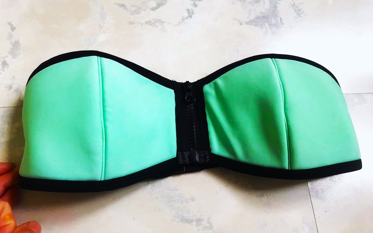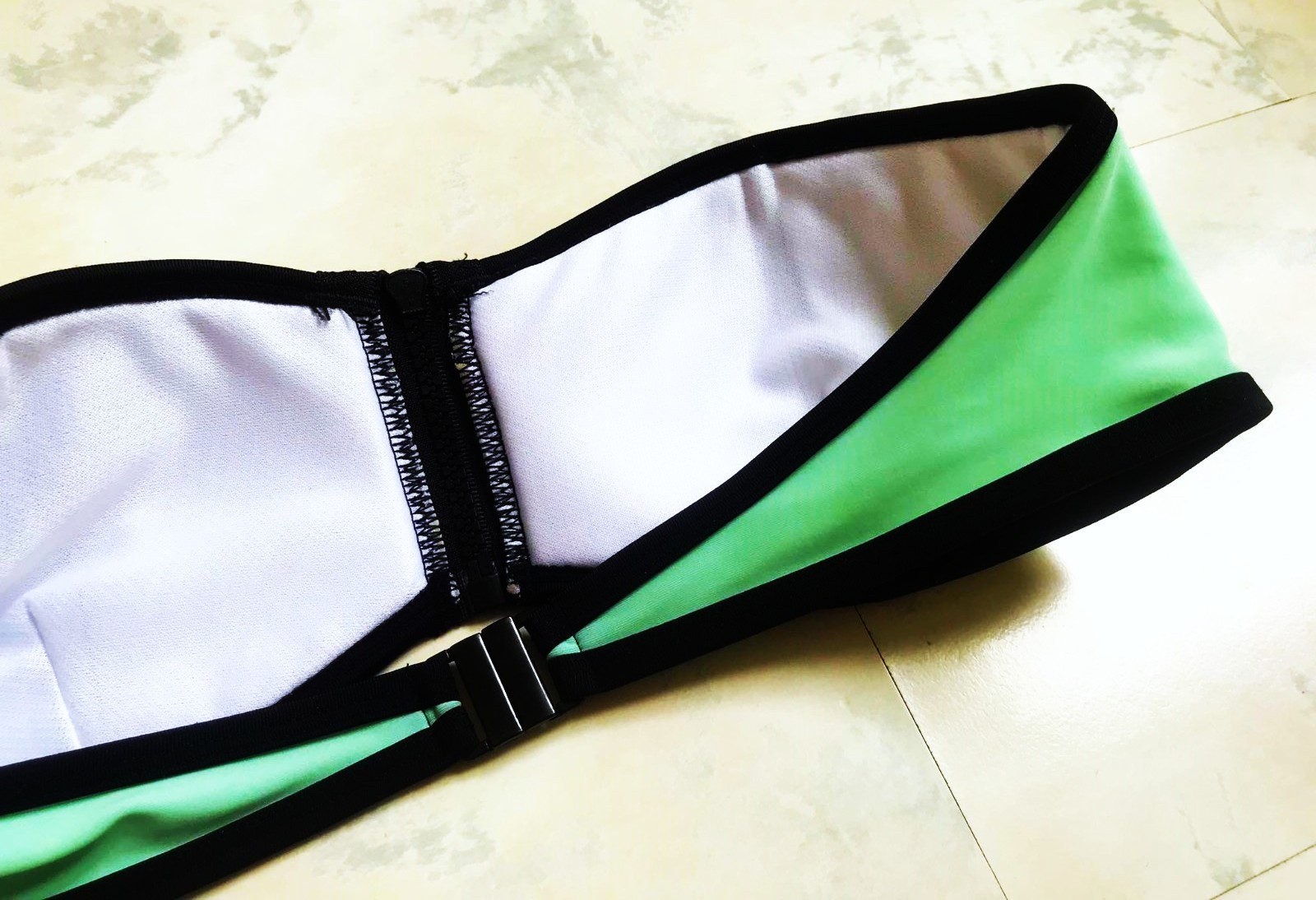 zaujímavé plavky,veľmi pekná farba,jemná pastelová,zaujímavé detaily,vpredu hrubý zips,dnu v košíkoch je otvor na prípadnú vložku pre efekt push - up,košíčky veľkosť A/B