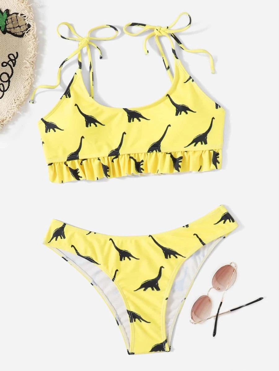 krásne žlté plavky s potlačou dinosaurov. mierne vystužené s vyberateľnými vypchávkami . klasický strih nohavičiek, podprsenka košíčky B