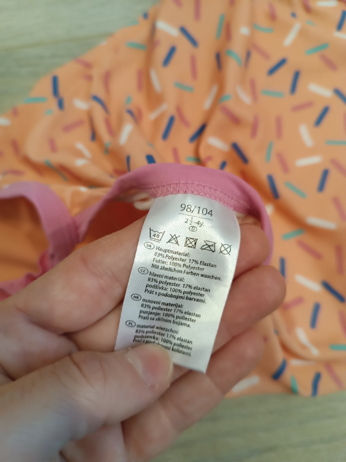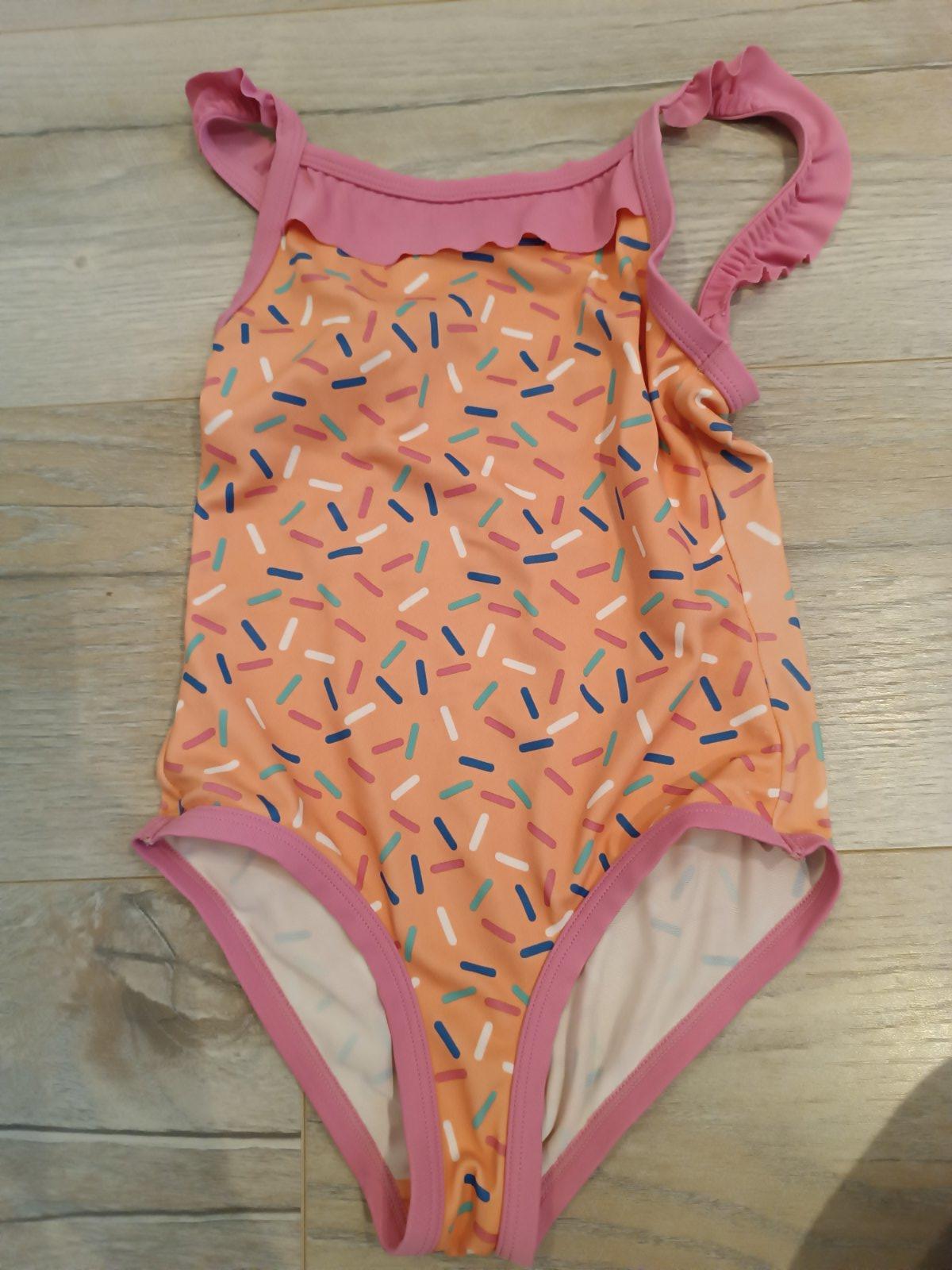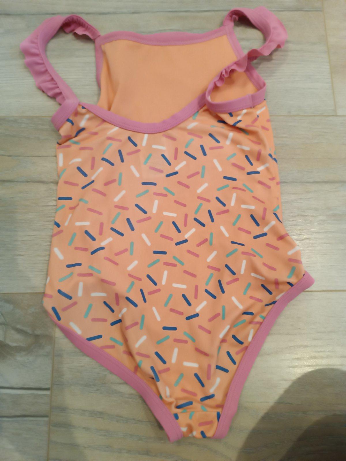 Výrazne neónové oranzove plavky s hviezdičkami. Veľkosť 98/104. Ramienka sú posuvné. Hviezdičky sa ligocu , ťažko sa to foti
