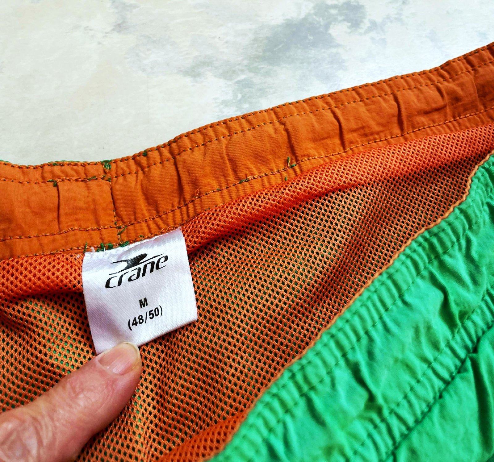 kvalitné značkové šortky vhodné aj ako plavky,značka CRANE,dlžka meraná na boku = 43 cm, pás max = 53 x 2 cm,aj menej,je tam šnúrka a gumička,gumičky na sieťke na nohy sú jemne povolené užívaním