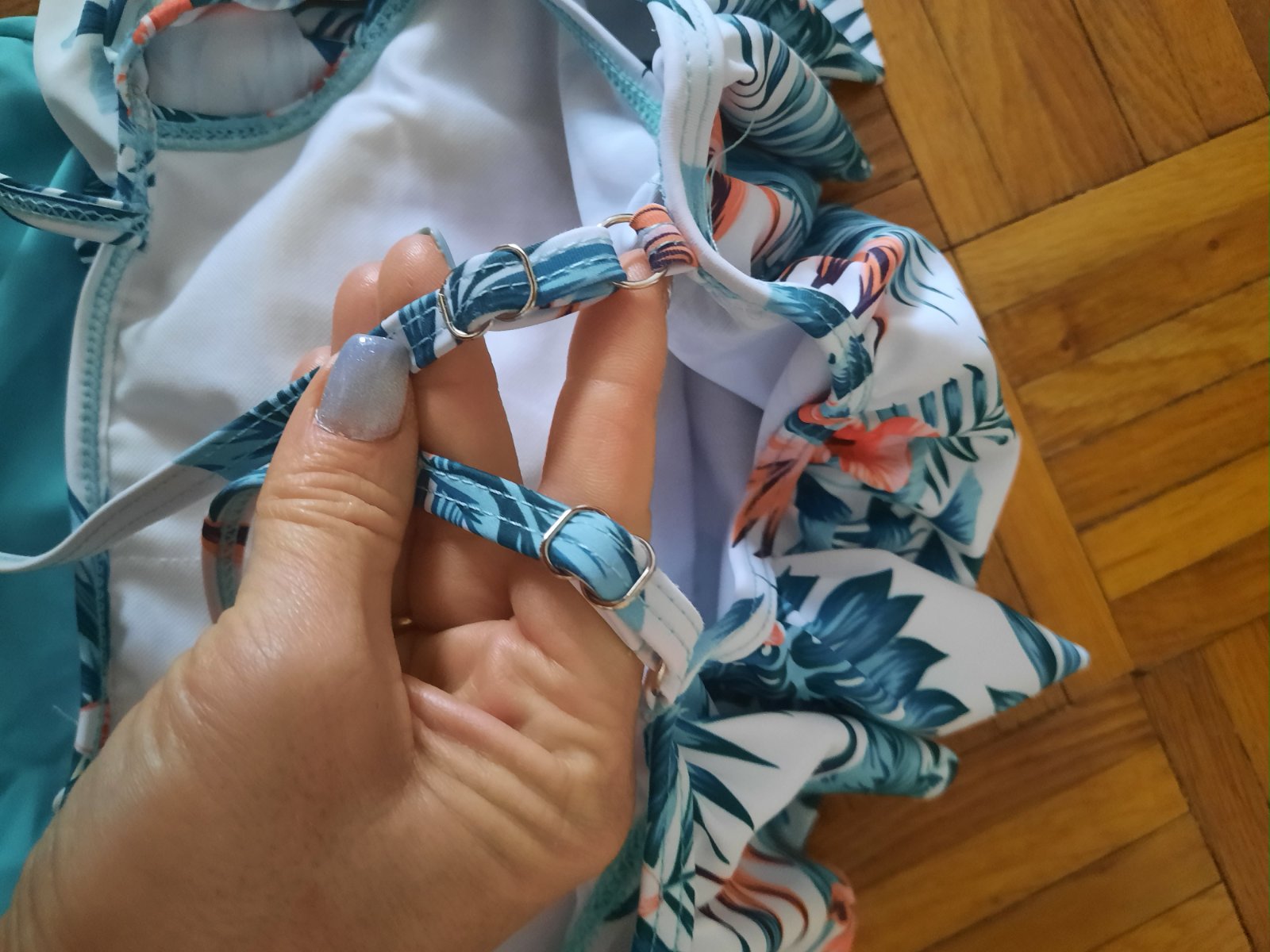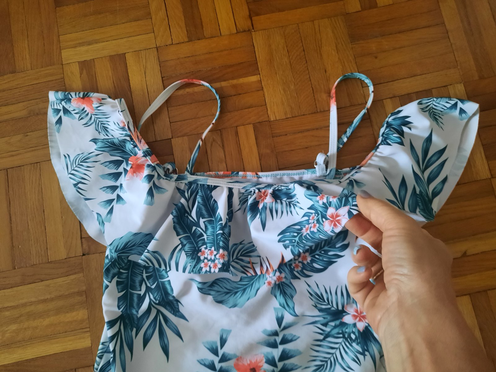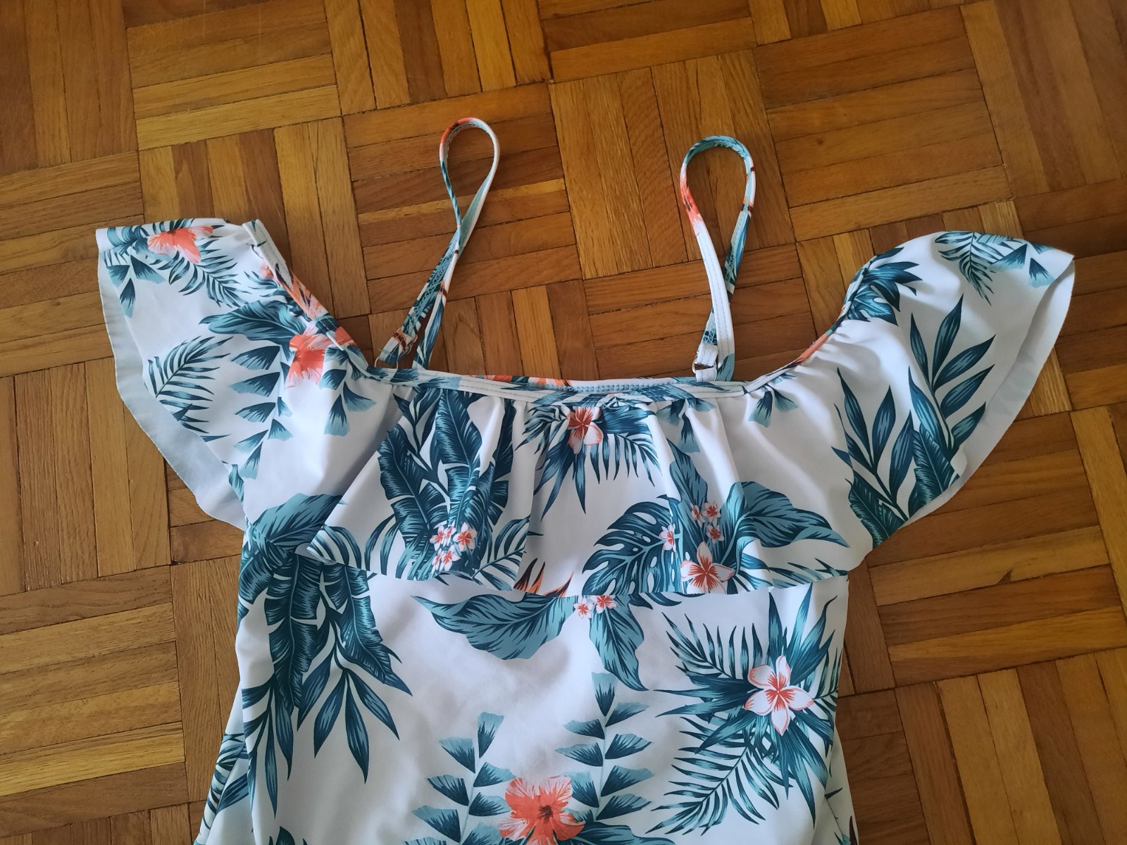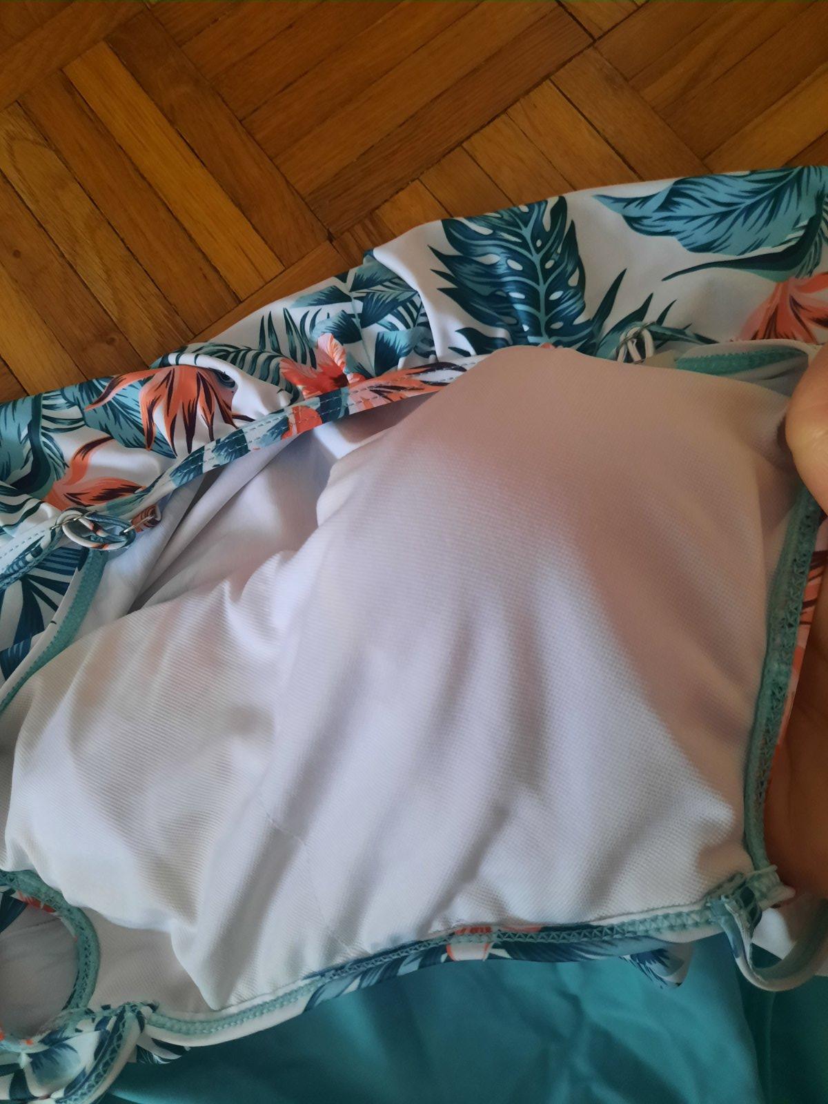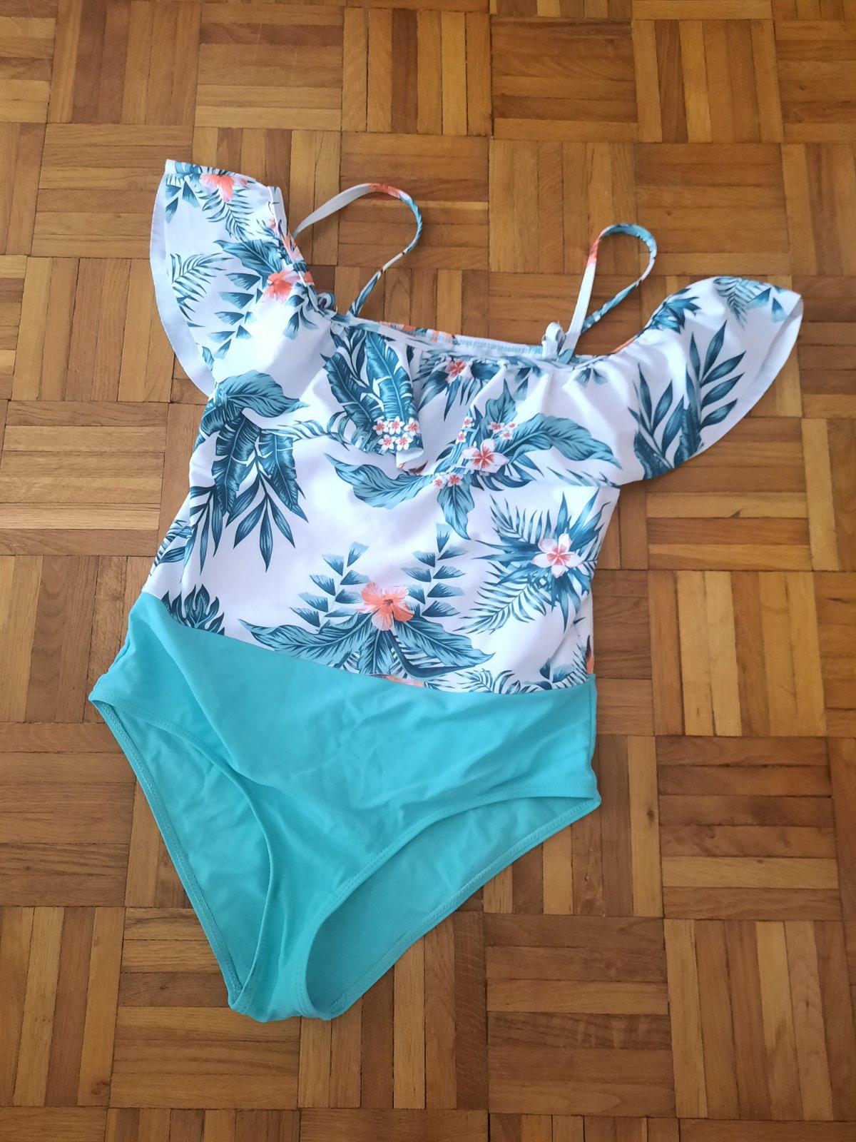 Krásne vzorované celé plavky-boli iba vypraté. Okolo poprsia s volánom. Vo vnútri podprsenkovej časti sú vypchávky. Ramienka sú nastaviteľné. Pekná farebná kombinácia.
