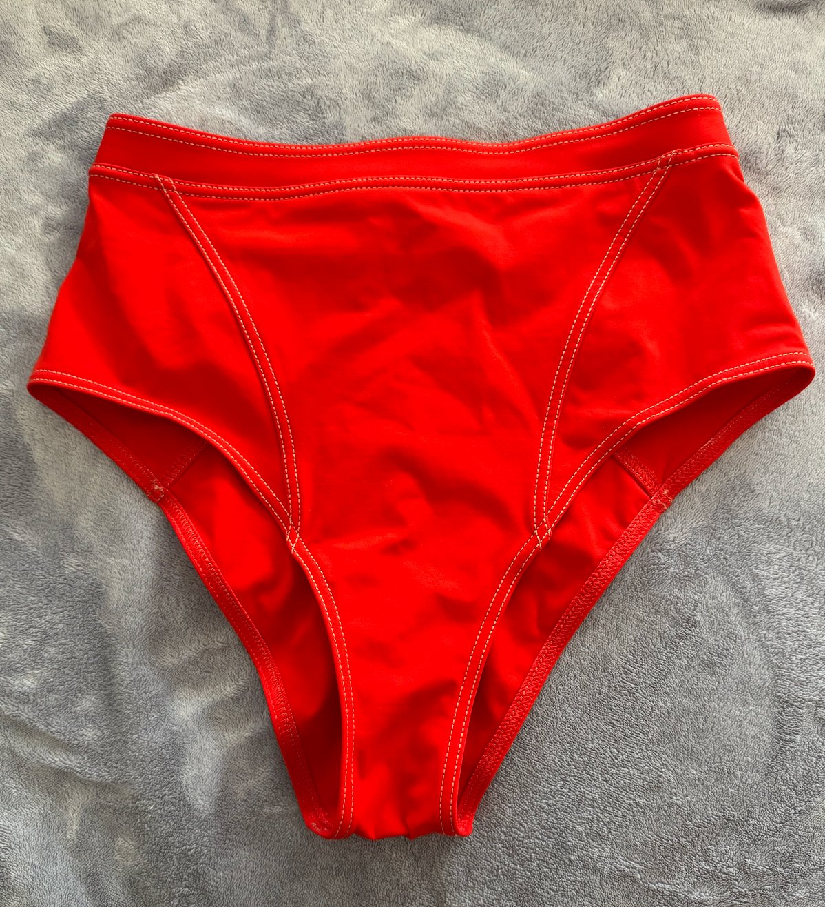 Perfektny plavkovy spodok VS Pink, novy, velkost S. Robi super siluetu spredu i zozadu. Jasna cervena farba. VS Pink dolny diel high waist high leg plaviek sytej ohnivej farby. Velkost S. Nove s v...