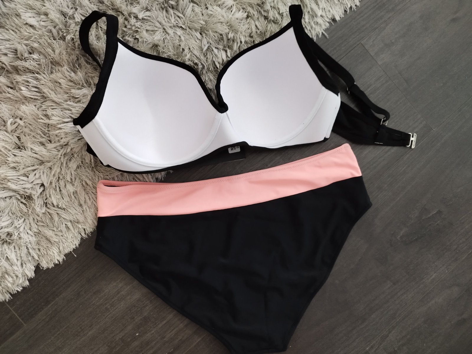 Vystužená podprsenka s nastaviteľnými pevnými širšími ramienkami. Nohavičky klasického vyššieho strihu. Značka FUBA.