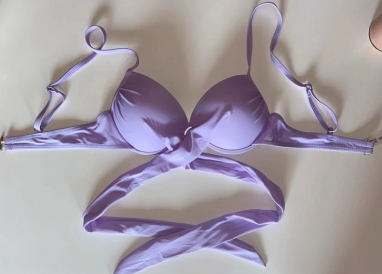Vrchny diel plaviek nenoseny , len vyskušany , košik je pevny A , ramienka nastaviteľne . Svetlofialova farba,cena plus pošta