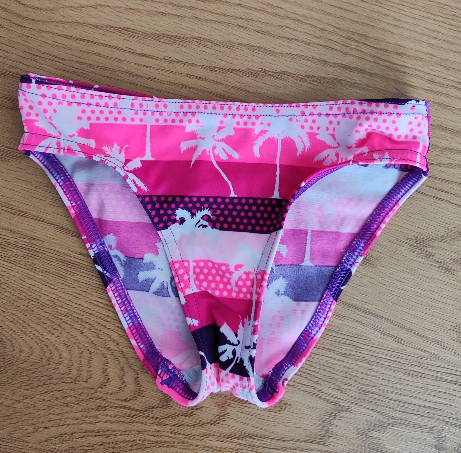 Plavky vo velkosti 98/104, parx oblecene, nohavicky som zmensovala, kedze mala je chuducka (odparanim stehu sa daju zvacsit)
