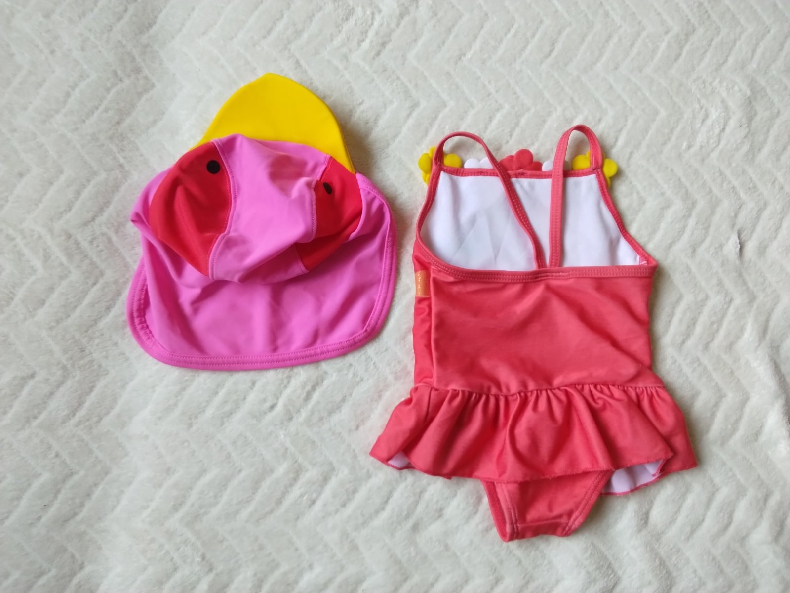 Málo nosené, veľkosť na 3 mes.,farba ako na foto, kupacia čiapka,cena spolu 2.50€.Je možný osobný odber v DL, po dohovore a kúpe nad 8.00€ aj v Ba na autobus.st., alebo poštou.