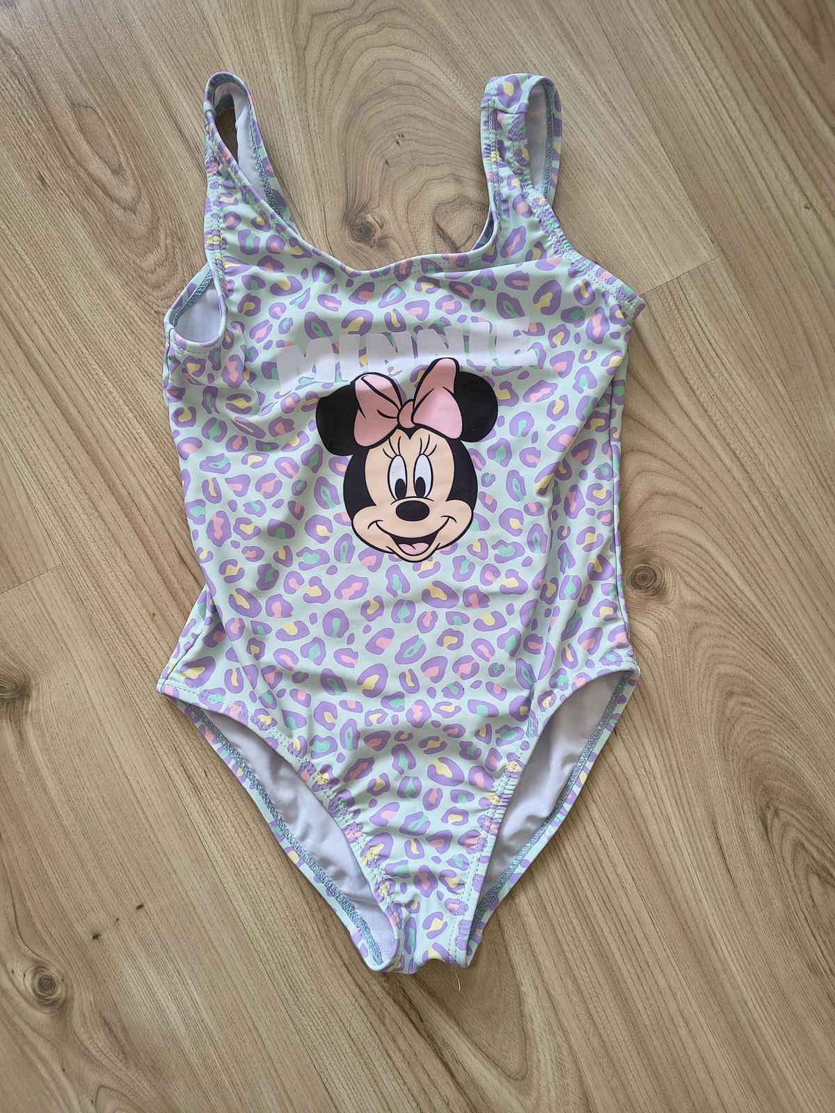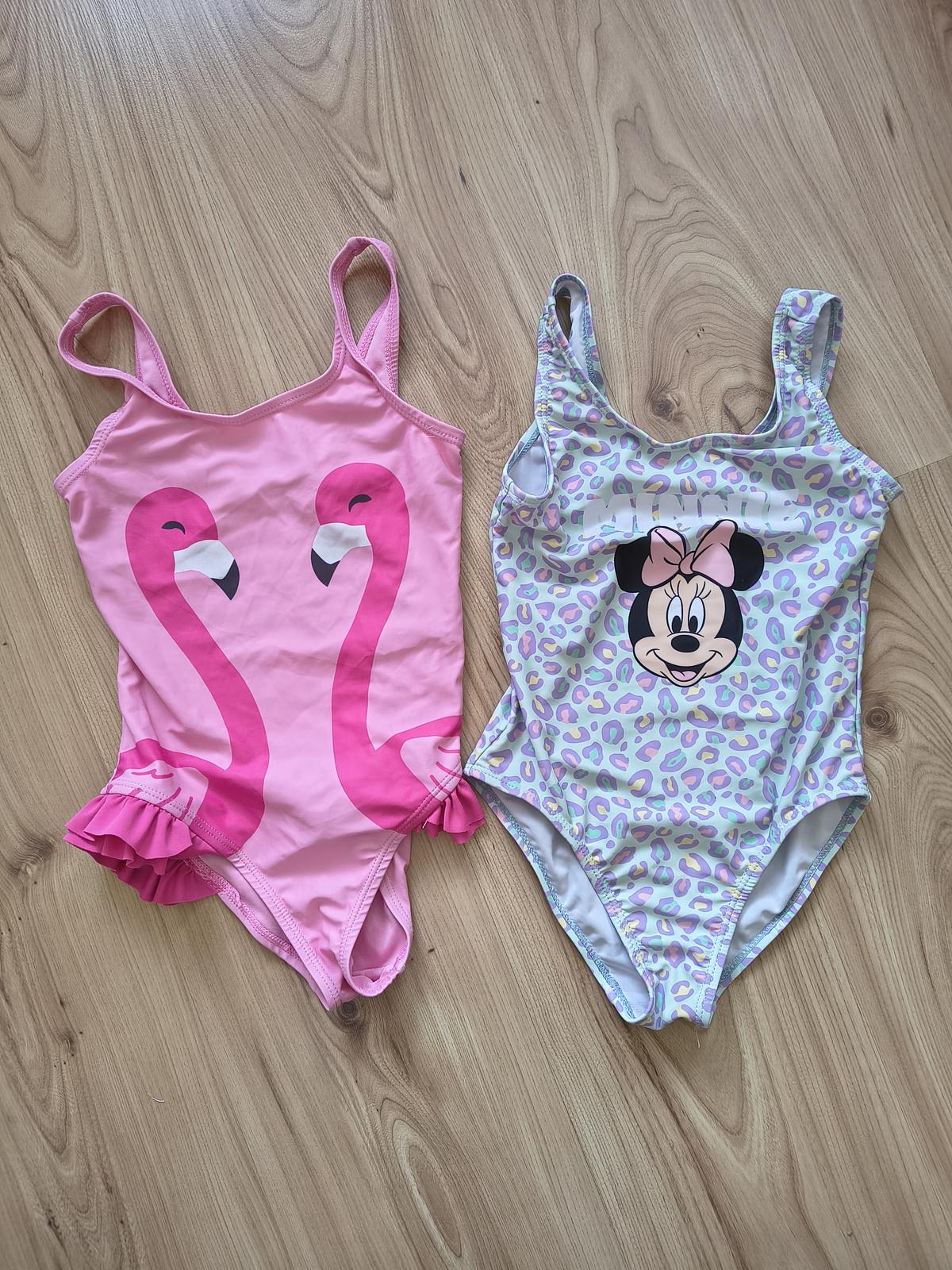 2x dievčenské jednodielne plavky, ružové s volánikmi po bokoch zn Lupilu, veľkosť 110/116, s obrázkom Minnie zn Sinsay, veľkosť 116. Oblečené pár krát, na striedačku.