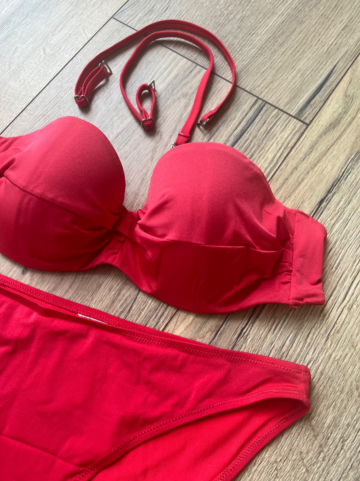 Predám pekne plavky červene - vrch strih bardotky s odnímateľnými ramienkami a spodok klasicky strih - velkost sedi 36 - 38 - použité max 3x ako nové